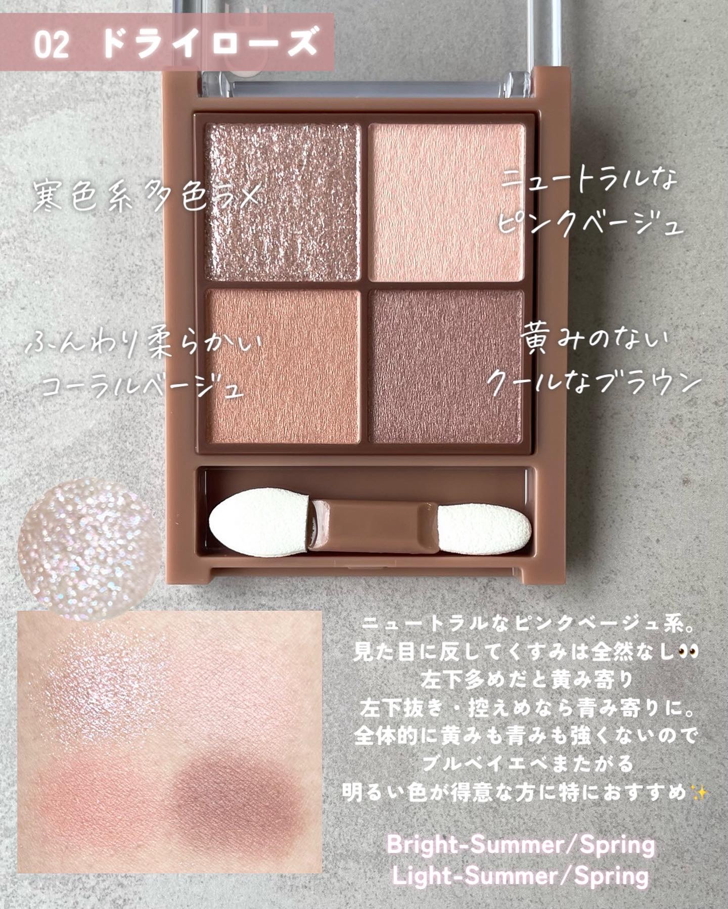 - 透け感マット×濃厚ブラウンの4色アイシャドウ。 しっかり目元を引き締めるビターなブラウンカラー。 透け感のあるブラウンを重ねて、自然な陰影のある目元へ。 ふんわり柔らかなパウダーなので、スルスル伸びてまぶたにピタッと密着。 保湿成分(スクワラン、ホホバ種子油)配合。