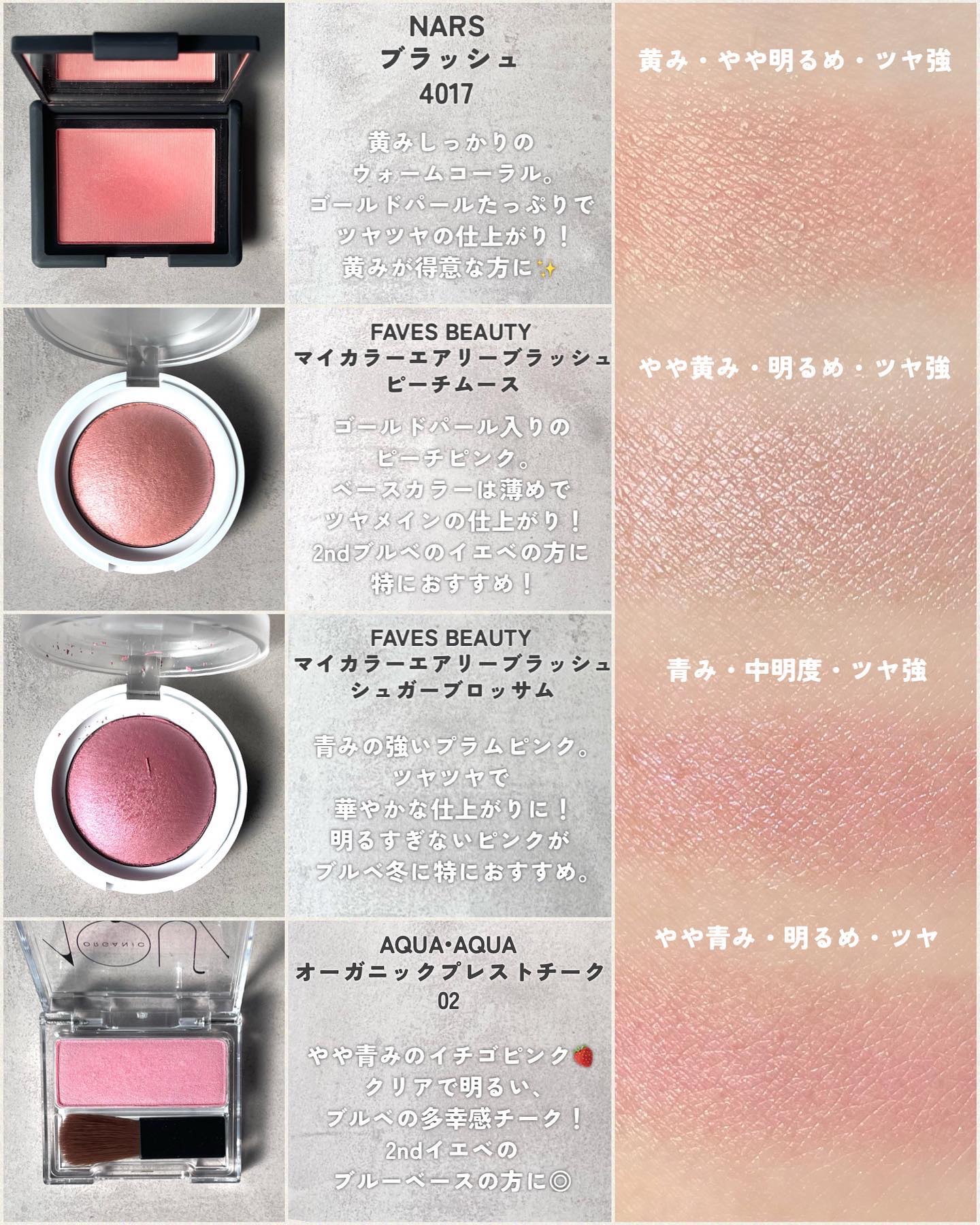 粉質がすごく良くなって、しっとり感とツヤ感が強くなりました! 04が個人的大ヒットで🥹💯 他のチークと混ぜて使うと、ツヤっぽくほわーっとした色付きになって最高! チーク要らない派の方に是非試してみて欲しいカラーです🫶🏻