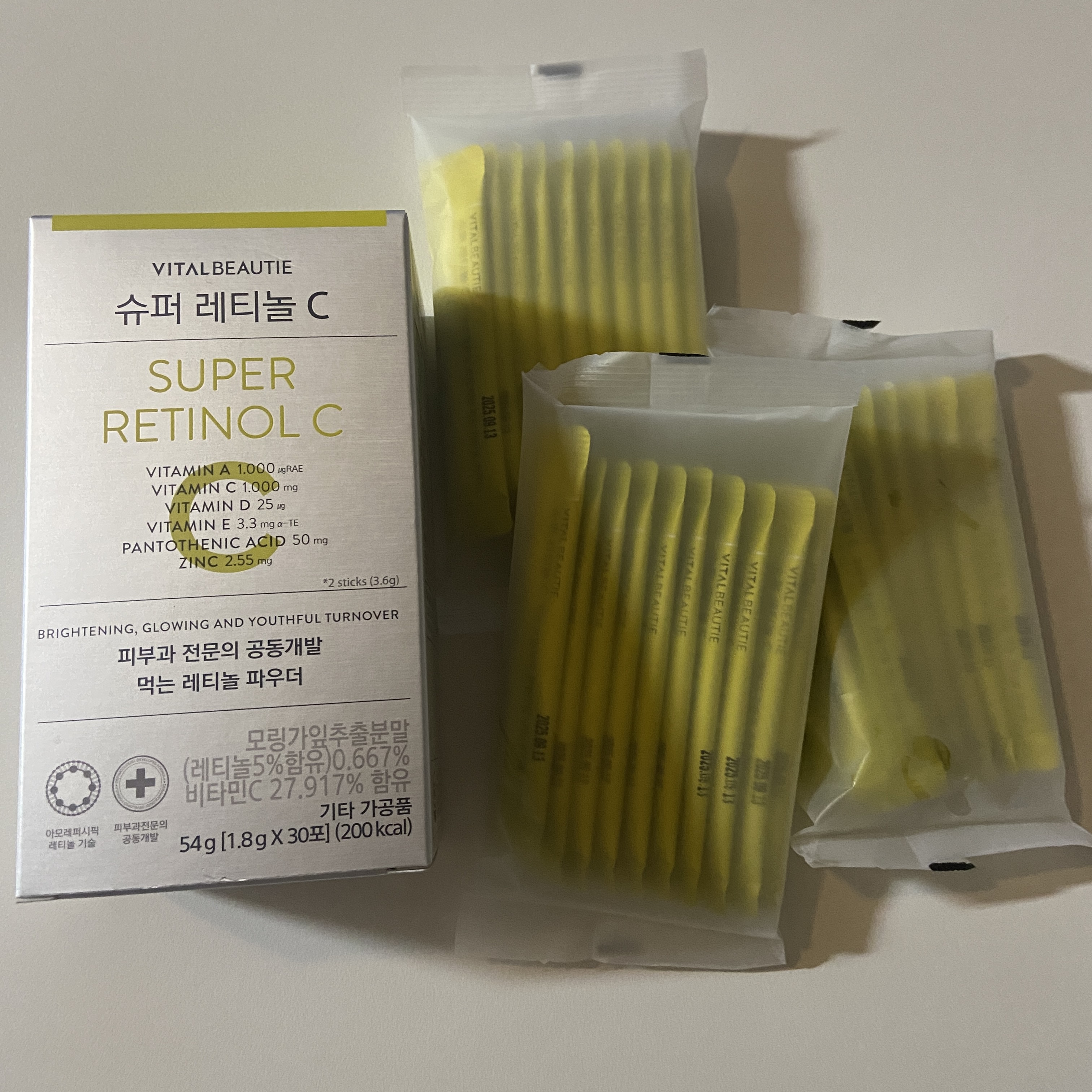 - 食べるタイプのレチノール 1) 専門家のフォーミュラ Flex! - 皮膚科専門医とアモーレパシフィックが共同開発 29年間蓄積したレチノール技術で完成! 食べるレチノールプロテクション技術を適用 (ビタミンA、1000ugRAE配合*) 2) 明るく輝く! - 豊富に含むビタミンC1,000mg含有* - パントテン酸1日栄養成分基準配合* - ビタミンE、ビタミンD、亜鉛 副成分 L-システインとヘスペリジンを配合 3) さわやかなシトラスの味 「ヴィーガンレチノール」 - ヴィーガン認証を取得した毎日摂取できる美味しいレチノール *上記の栄養成分の数値は、2包摂を基準に作成された含量です *お召し上がり方! 1回1~2包を 直接摂取してください