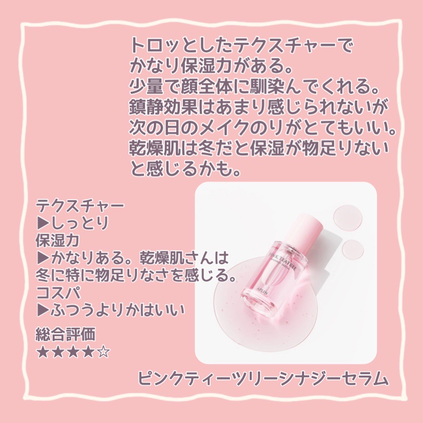 春〜夏にかけてはピッタリの保湿力だったけど、冬の酷い乾燥には、少し物足りなさを感じてしまいました🥲 メイクの時にカサカサしてしまう人は、化粧水をたっぷり惜しまずパッティングして使ってみると、多少改善されると思います。 私のようにニキビが気になる方は、とにかく保湿をしてください❕ ニキビの原因は様々ですが、今は乾燥からくるニキビがとても多くなる季節です。保湿をするだけで肌の状態はかわります。 APLINはすぐに効果はでませんが、使い続けることが大事かな、とおもいます🥹👍
