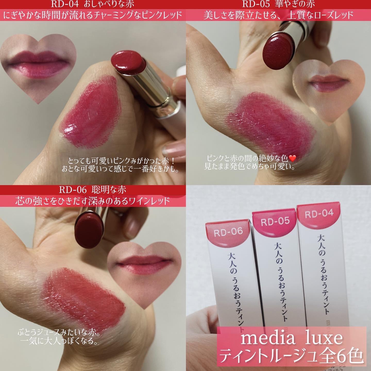 メディアリュクスさまからいただきました!medialuxeティントルージュ大人のための血色感ブーストリップ!みずみずしい塗り心地でツヤリップに♡透け感のある大人レッドがとってもかわいい〜!04〜06はブルベ向けカラーどれも好きな色(似合う色)...