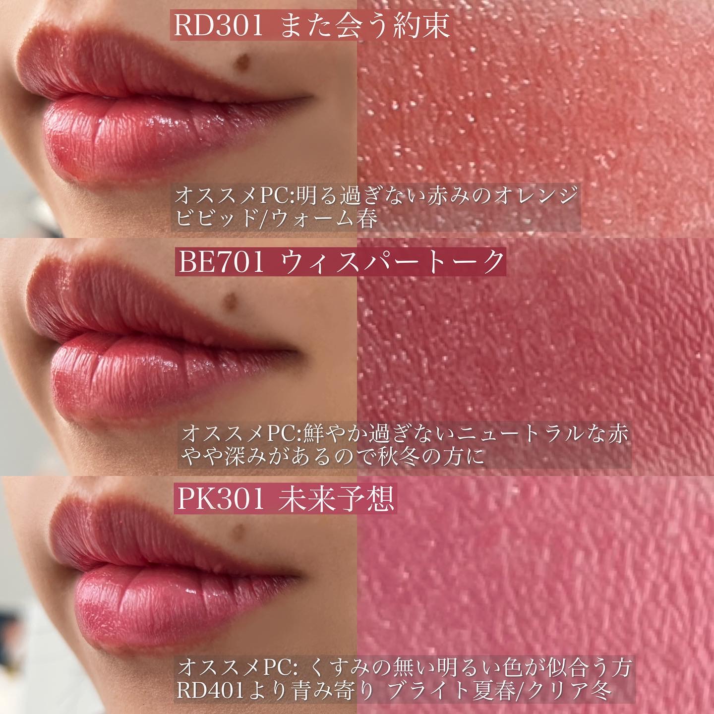 マスクにもつきにくく、色展開も豊富で高級感のあるパッケージ🤩 どれをとっても私は大好きなんですが、皆さんお持ちですか? サロンでも大人気なので現在は12色置いています。 あくまでオススメなので、濃いものは指でポンポン塗ったら春夏の人も使いやすいし、逆に柔らかな色のものも重ねれば濃くなるので、自分の好き!を大事にしてくださいね☺️❤️ ちなみにブルベ夏冬の私(クールサマー)の私は64.66が大好きです!!!!!!💘💘