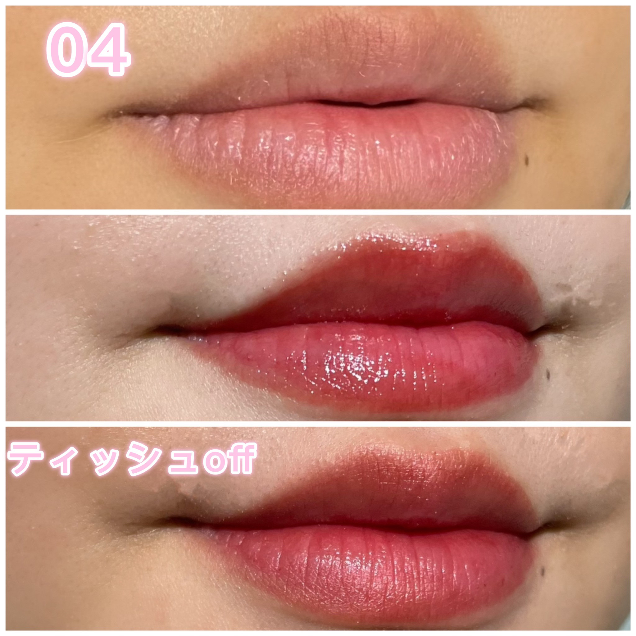 色持ち抜群ティント🩷 01&04はイエベさんにおすすめのカラー♡ 水のようなテクスチャーでスルスルのびる🫧 塗りたても少し時間をおけばベタつきにくいです! 色持ちは食事をしても元の唇の色まで戻ったことはほとんどありません! さすが飲み会リップ💄✨