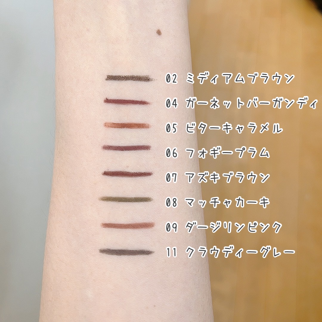ピンク系が多いなと思ったので ピンクだけのスウォッチも最後に載せてるよ🌸 10.12.13.14は限定です❤️🩹 ♡01/ディープブラック ♡02/ミディアムブラウン ♡03/ダークブラウン ♡04/ガーネットバーガンディ ♡05/ビターキャラメル ♡06/フォギープラム ♡07/アズキブラウン ♡08/マッチャカーキ ♡09/ダージリンピンク ♡10/ココアグレージュ(限定) ♡11/クラウディーグレー ♡12/イチゴストーム(限定) ♡13/ブラッドイチゴ(限定) ♡14/イチゴキューピッド(限定)