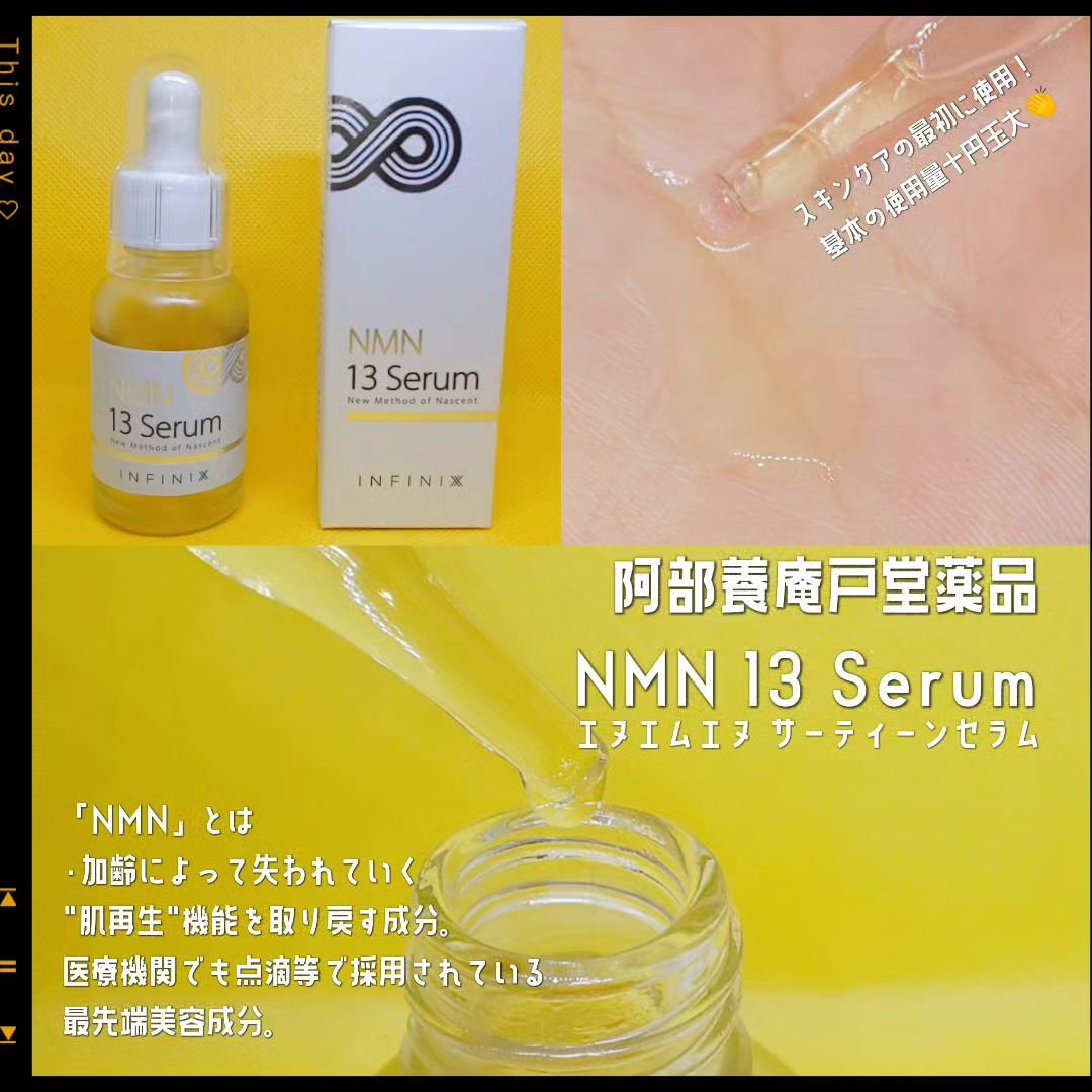 - 日本初*1リポソーム化NMN配合の美容液。先進の美容成分として注⽬されているNMN*2だけでなく、3つのヒト幹細胞培養液*2や7つの機能性ペプチド*2などをリポソーム化し、よりお肌に浸透*3しやすい処方に。リニューアルに伴い、NMN配合量を従来品の2倍に増やし、さらにNMNの魅力をご体感いただけるようになりました。美容科学を追求した『NMN 13 セラム』独自の「オールエフェクト処方®」が、美肌スイッチに同時にアプローチし、弾むようなみずみずしいお肌へと導きます。 *1 ・調査名:「NMN化粧品に関する調査」(TPCマーケティングリサーチ㈱調べ)・調査対象:1.「@cosme」に記載のあるNMN配合化粧品 2.「楽天市場」「Amazon」「Yahoo!ショッピング」で販売されているNMN配合化粧品 3.その他MLMチャネルで販売されているNMN配合化粧品のいずれかに該当するもの ・調査期間:2022年4月1日~20日 *2保湿成分 *3角層まで。当社既製品『NMN SirteenSerum』との比較。