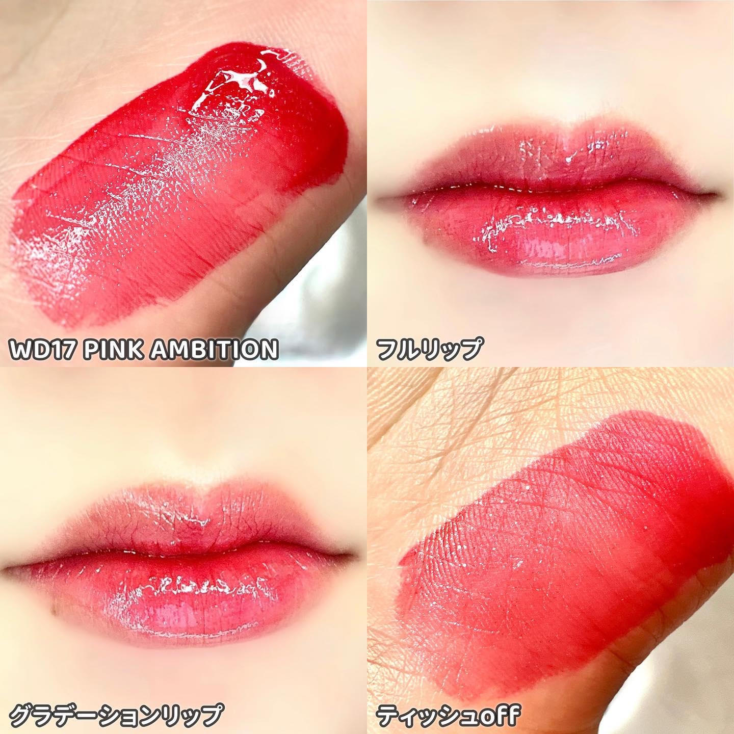 - <WD2 ビトゥン ローズ> 水、ジフェニルジメチコン、リンゴ酸ジイソステアリル、ビスジグリセリルポリアシルアジペート-2、水添ポリイソブテン、ジグリセリン、DPG、セチルPEG/PPG-10/1ジメチコン、イソステアリン酸ソルビタン、ポリソルベート60、ペンチレングリコール、オクチルドデカノール、セテアレス-20、(アクリル酸ヒドロキシエチル/アクリロイルジメチルタウリンNa)コポリマー、スクワラン、フェノキシエタノール、ポリグリセリン-3、ステビオシド、香料、エチルヘキシルグリセリン、グリセリン、シア脂、ツバキ種子油、トリ(カプリル酸/カプリン酸)グリセリル、アルガニアスピノサ核油、ホホバ種子油、アーモンド油、アンズ核油、月見草油、オリーブ果実油、テトラ(ジ-t-ブチルヒドロキシヒドロケイヒ酸)ペンタエリスリチル、カニナバラ果実エキス、マンゴー果実エキス、赤104(1)、赤227、黄5、青1 <WD3 ピンク ヘイズ> 水、ジフェニルジメチコン、リンゴ酸ジイソステアリル、ビスジグリセリルポリアシルアジペート-2、水添ポリイソブテン、ジグリセリン、DPG、セチルPEG/PPG-10/1ジメチコン、イソステアリン酸ソルビタン、ポリソルベート60、ペンチレングリコール、オクチルドデカノール、セテアレス-20、(アクリル酸ヒドロキシエチル/アクリロイルジメチルタウリンNa)コポリマー、スクワラン、フェノキシエタノール、ポリグリセリン-3、ステビオシド、香料、エチルヘキシルグリセリン、グリセリン、水酸化Al、ポリアクリル酸アンモニウム、BG、アルガニアスピノサ核油、シア脂、ツバキ種子油、トリ(カプリル酸/カプリン酸)グリセリル、アーモンド油、アンズ核油、ホホバ種子油、月見草油、オリーブ果実油、テトラ(ジ-t-ブチルヒドロキシヒドロケイヒ酸)ペンタエリスリチル、マンゴー果実エキス、カニナバラ果実エキス、酸化チタン、赤104(1)、赤227、黄5、青1 <WD4 オールウェイズ ヤング> 水、ジフェニルジメチコン、リンゴ酸ジイソステアリル、ビスジグリセリルポリアシルアジペート-2、水添ポリイソブテン、ジグリセリン、DPG、セチルPEG/PPG-10/1ジメチコン、イソステアリン酸ソルビタン、ポリソルベート60、ペンチレングリコール、オクチルドデカノール、セテアレス-20、(アクリル酸ヒドロキシエチル/アクリロイルジメチルタウリンNa)コポリマー、スクワラン、フェノキシエタノール、ポリグリセリン-3、ステビオシド、香料、エチルヘキシルグリセリン、グリセリン、シア脂、ツバキ種子油、トリ(カプリル酸/カプリン酸)グリセリル、アルガニアスピノサ核油、ホホバ種子油、アーモンド油、アンズ核油、月見草油、オリーブ果実油、テトラ(ジ-t-ブチルヒドロキシヒドロケイヒ酸)ペンタエリスリチル、カニナバラ果実エキス、マンゴー果実エキス、赤104(1)、赤227、黄5、青1 <WD6 クラッシュド パンプキン> 水、水添ポリイソブテン、リンゴ酸ジイソステアリル、ビスジグリセリルポリアシルアジペート-2、ジフェニルシロキシフェニルトリメチコン、ジフェニルジメチコン、ポリグリセリン-3、オクチルドデカノール、ポリソルベート60、セチルPEG/PPG-10/1ジメチコン、ラウリン酸ポリグリセリル-10、ペンチレングリコール、1,2-ヘキサンジオール、(アクリル酸ヒドロキシエチル/アクリロイルジメチルタウリンNa)コポリマー、PEG-60水添ヒマシ油、セテアリルアルコール、スクワラン、キシリトール、エチルヘキシルグリセリン、香料、ポリアクリル酸アンモニウム、イソステアリン酸ソルビタン、水酸化Al、フェノキシエタノール、BG、トコフェロール、酸化チタン、酸化鉄、赤227、黄4、黄5、青1 <WD8 ビンテージ カラント> 水、水添ポリイソブテン、リンゴ酸ジイソステアリル、ビスジグリセリルポリアシルアジペート-2、ジフェニルシロキシフェニルトリメチコン、ジフェニルジメチコン、オクチルドデカノール、ポリグリセリン-3、ポリソルベート60、セチルPEG/PPG-10/1ジメチコン、ラウリン酸ポリグリセリル-10、1,2-ヘキサンジオール、ペンチレングリコール、(アクリル酸ヒドロキシエチル/アクリロイルジメチルタウリンNa)コポリマー、PEG-60水添ヒマシ油、セテアリルアルコール、スクワラン、キシリトール、エチルヘキシルグリセリン、香料、イソステアリン酸ソルビタン、トコフェロール、赤104(1)、赤227、黄5、青1 <WD9 ミスター ストレンジャー> 水、水添ポリイソブテン、リンゴ酸ジイソステアリル、ビスジグリセリルポリアシルアジペート-2、ジフェニルシロキシフェニルトリメチコン、ジフェニルジメチコン、オクチルドデカノール、ポリグリセリン-3、ポリソルベート60、セチルPEG/PPG-10/1ジメチコン、ラウリン酸ポリグリセリル-10、1,2-ヘキサンジオール、ペンチレングリコール、(アクリル酸ヒドロキシエチル/アクリロイルジメチルタウリンNa)コポリマー、セテアリルアルコール、PEG-60水添ヒマシ油、スクワラン、キシリトール、エチルヘキシルグリセリン、香料、イソステアリン酸ソルビタン、水酸化Al、ポ