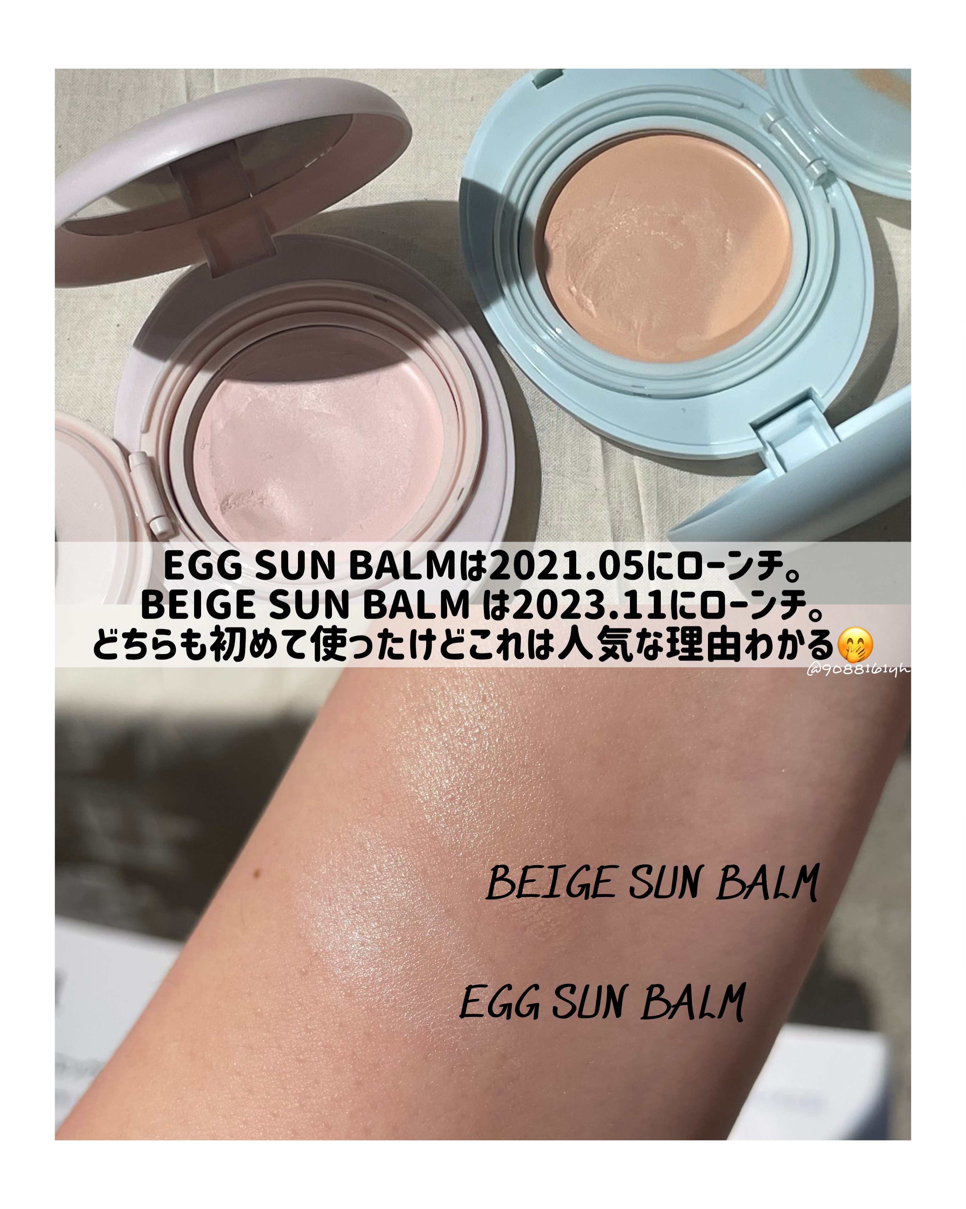 まず、エッグサンバームはほんのりピンク色で、ベースから日焼け止めまでがこれひとつで叶っちゃうスグレモノ♡ かなりしっかりしっとりするタイプで、超絶乾燥肌の私はものすっごく気に入りました! バームに対してクッションは、色なしのスタンダードなタイプ。しっとりしたテクスチャーではあるものの、バームよりもずっと軽いマット質感です。 そしてクレンジングウォーターは、泡で出てくるポンプタイプ。先述したバームやクッションのみだったら、このクレンジングウォーターのみでオフできるそうです☺️楽ちんでうれしい! バームのピンク感は塗ることで血色が良く見えます🙆♀️ クッションは落ち着いたヘルシーなイメージに✨ツヤは抑えめですが、完全にマットというよりはセミマットのようなほんのりと自然にツヤが残るような質感なのでお仕事に行く時もたくさん使えそう🙆♀️