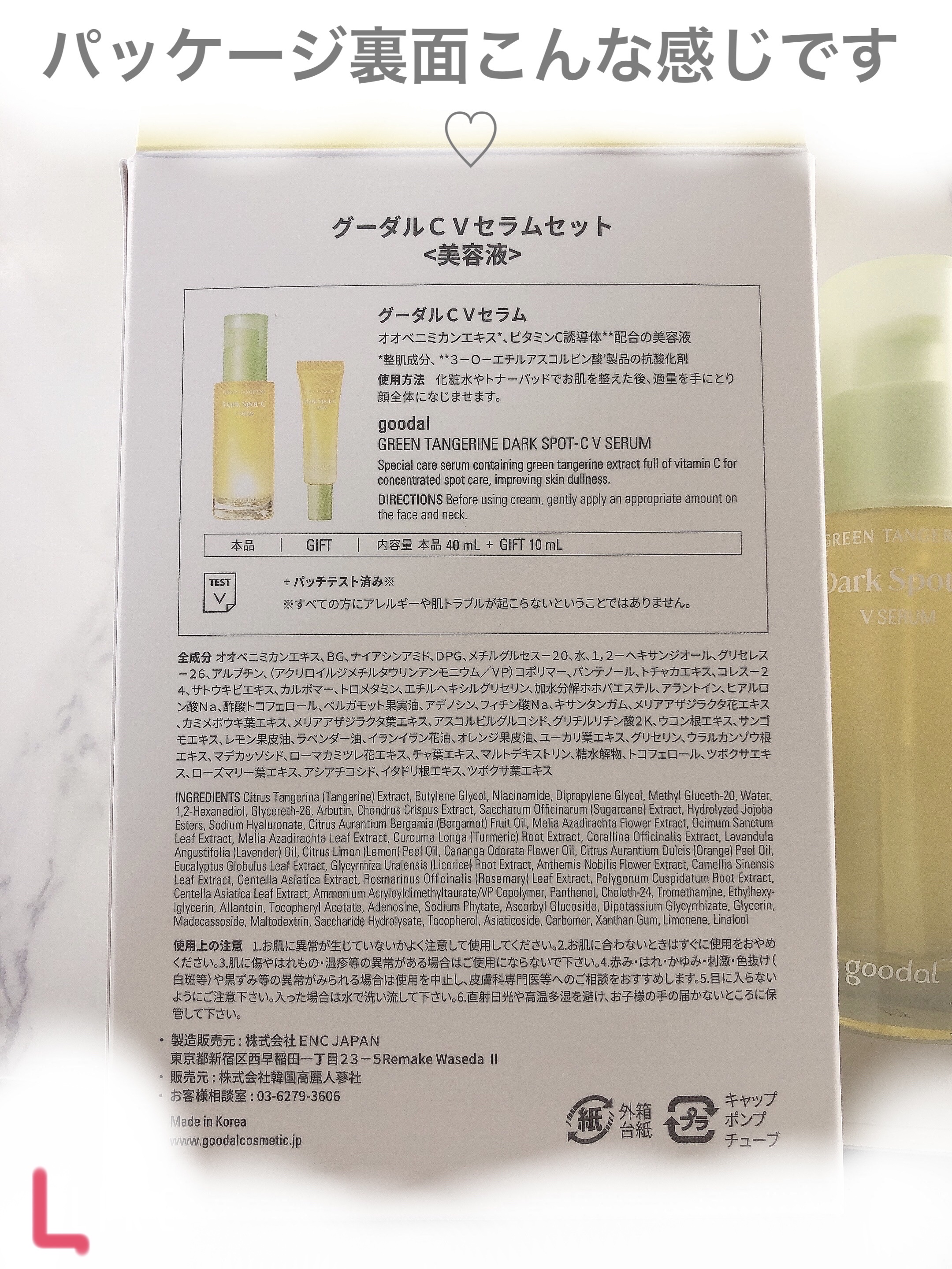 - ◆グーダル グリーンタンジェリンビタCダークスポットケアセラム 40ml 累積販売数:650万個*1 グーダルならではの厳格な基準*2を通過したこだわりの新鮮な済州無農薬青ミカンを直接収穫してAir Bubble Brewing工法で抽出 。生き生きとした印象の肌に。青みかんエキス(タンジェリンエキス)70%配合。乾燥によるくすみをケアし、透明感のある肌に導きます。 お肌のキメを整えるための整肌成分であるビタミンB3(ナイアシンアミド)が既存のグーダルグリーンタンジェリンビタCシミセラムプラスの2倍である4%になりました。 *1:2018.02~2023.09 全チャンネル販売数量基準|リニューアル製品を含む *2:7月中旬から8月中旬の間に獲れたての青ミカンの鮮度を現場ですぐに評価して選別し、超低温で管理、低い温度から直接抽出する青みかんエキス(整肌成分) <酸度>:㏗測定器、リトマス紙使用/酸度3.0~4.0かを確認 <果皮水分含量>:鮮度評価指標で皮の水分含量を測定