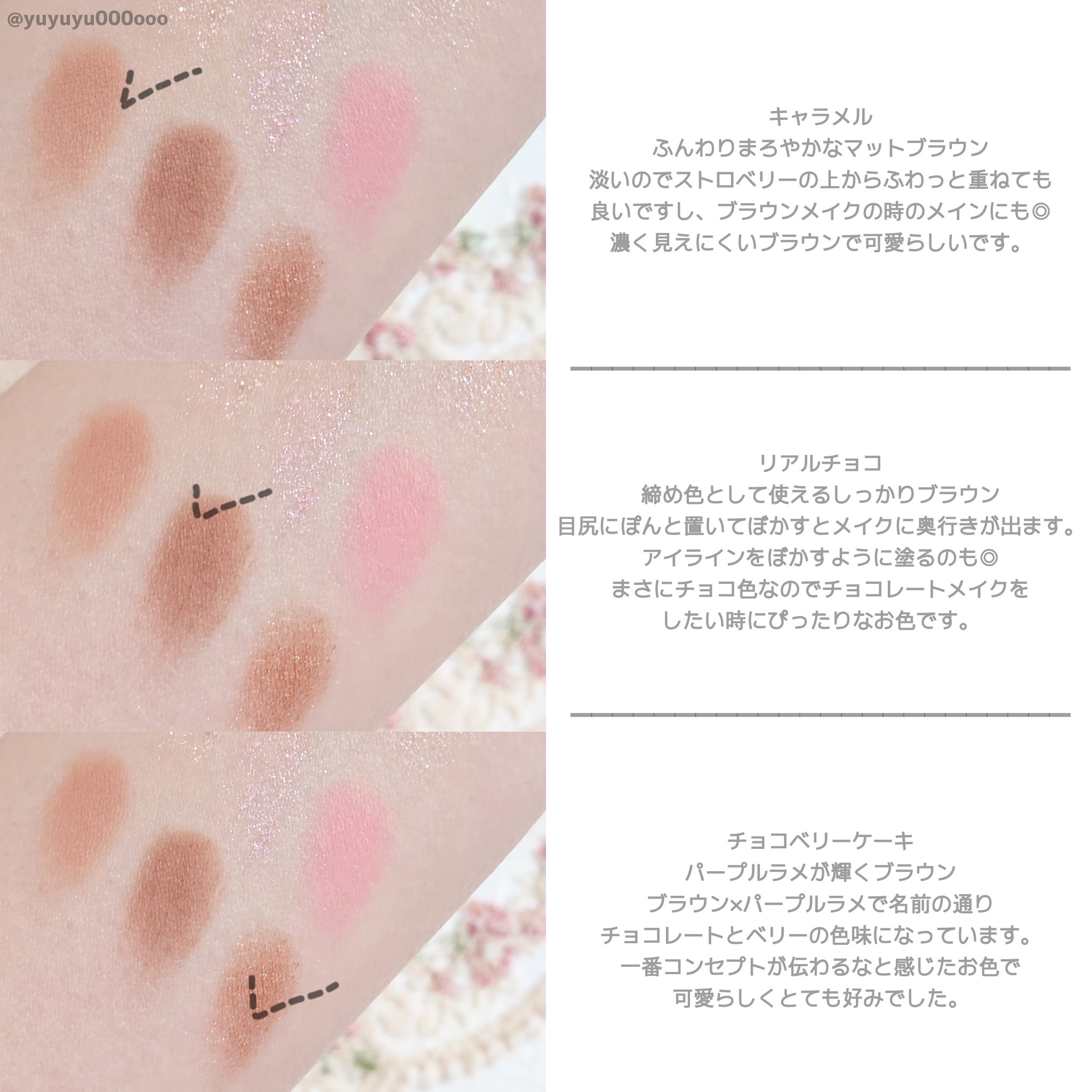 【使った商品】dasiqueシャドウパレット【色味】19キャンディーベリーデイジークの可愛らしいイメージに、POPさを加えた感じストロベリー×ダークミルクコーヒーみたいな色味【ラメorマット】細かいキラキラする感じのラメ中間色と締め色はセミマ...