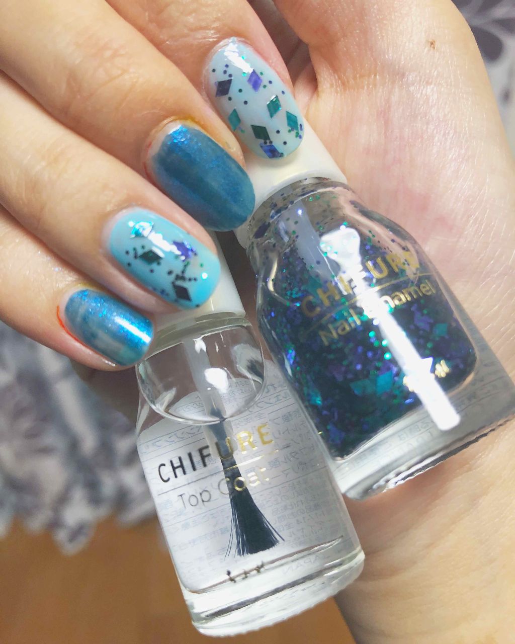 セルフネイル💅第2弾8月になったので心機一転してネイルを変えました🌻ずっとちふれのマニキュアが気になってたので購入して速攻でトライ😌💗海感を出したかったけど塗って思ったことは「な、な、なんだ!?このジャスミン感は!?👗💜」でした淡めの水色のマ...