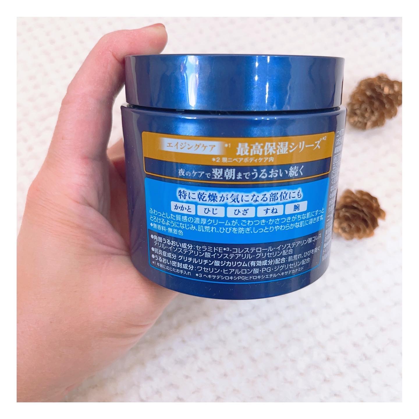 - 【医薬部外品】 エイジングケア*1。最高保湿シリーズ*2ボディクリーム。 ふわっとした質感の濃厚クリームが、ごわつき・かさつきがちな肌にすっととろけるようになじみ、肌荒れ、ひびを防ぎ、しっとりやわらかな肌に導きます。 ◆無香料・無着色 ●抗炎症成分 グリチルリチン酸ジカリウム(有効成分)配合:肌荒れ、ひびを防ぎます。 *1年齢に応じたお手入れ *2現ニベアボディケア内