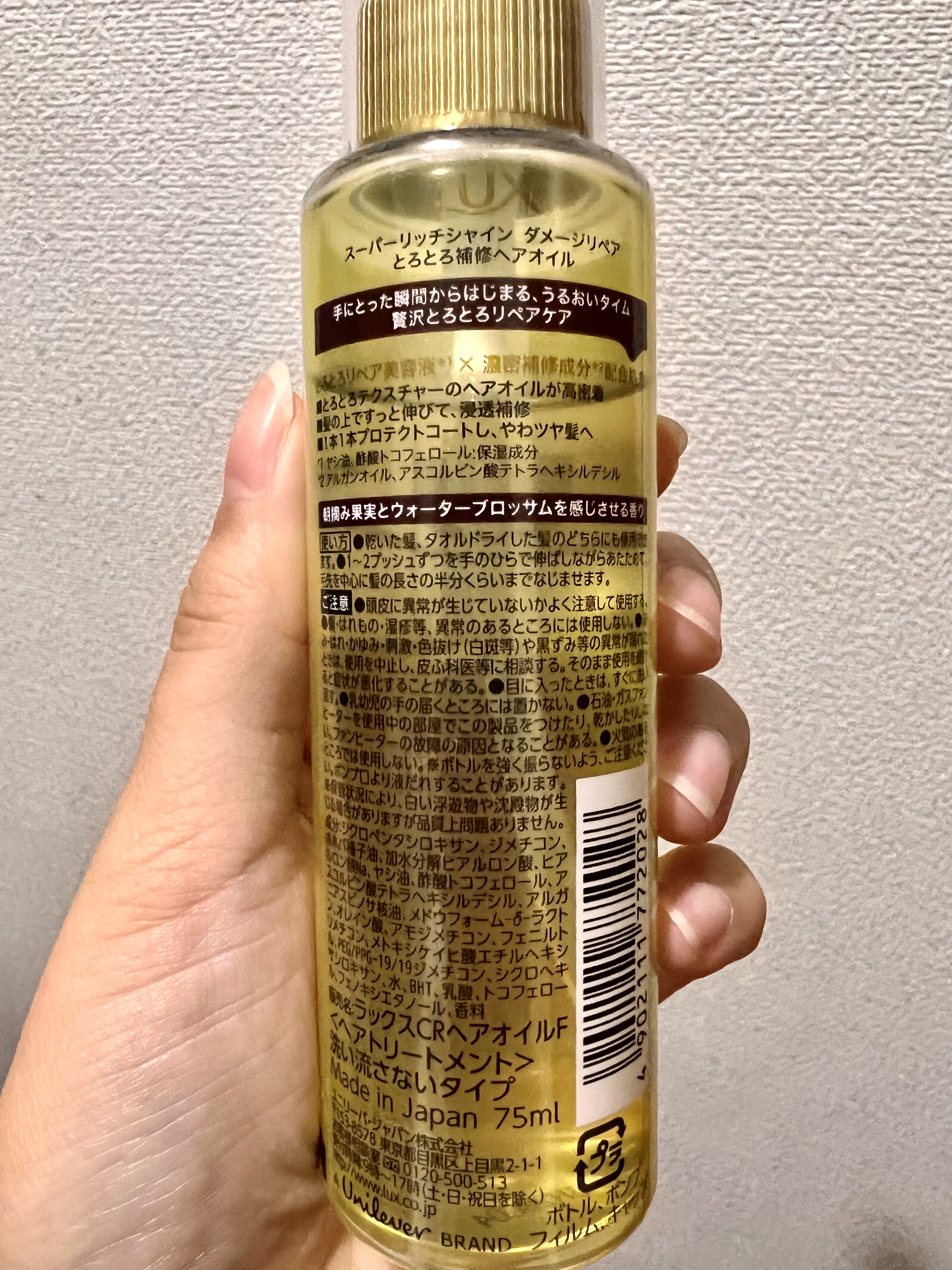 贅沢にとろとろリペアケアできるヘアオイル。 程よくとろみがあり使いやすい! お風呂上がり後のタオルドライした髪に使用することが多いのですが、素早く髪に馴染ませることができます。 ドラッグストアでお手頃価格で買うことができてこのクオリティはすごい!!
