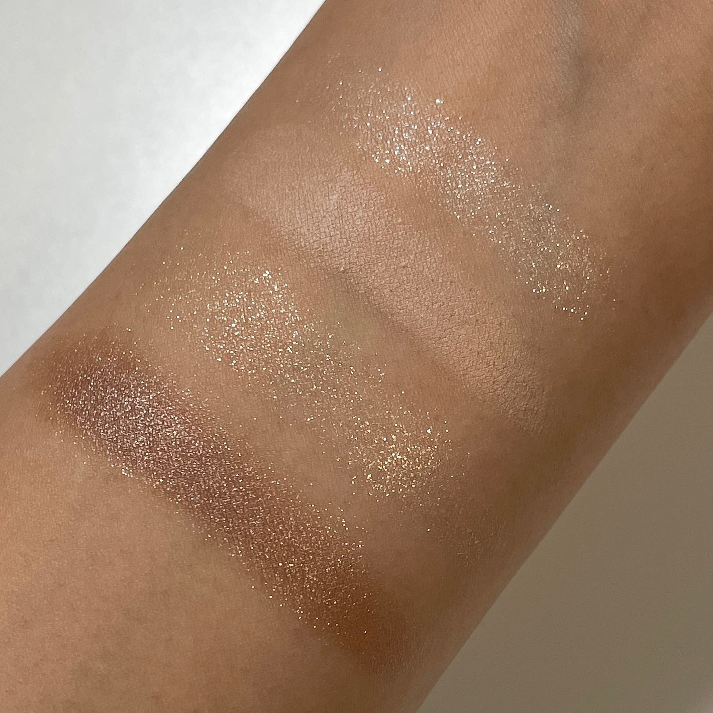 mude.の方がよりあたたかみのある印象で全体的に使いやすい色味が入っている感じ◎ ラメ感もギラギラするよりかは上品なキラキラ感✨ rom&ndはmude.に比べるとフレッシュな印象!春や夏に使うと映えそう❣️ ラメ感も強く、目立つかな。 似てるかもしれないからと買うのを長い間悩んでいましたが、仕上がりが全然変わってくるので、買って良かった😂❤️ 粉質はブランドも違うので違ったよ✨ rom&ndの方がしっとり感があって強く発色する感じ。 mude.は淡い発色で、初心者さんも使いやすいと思った🫶🏻