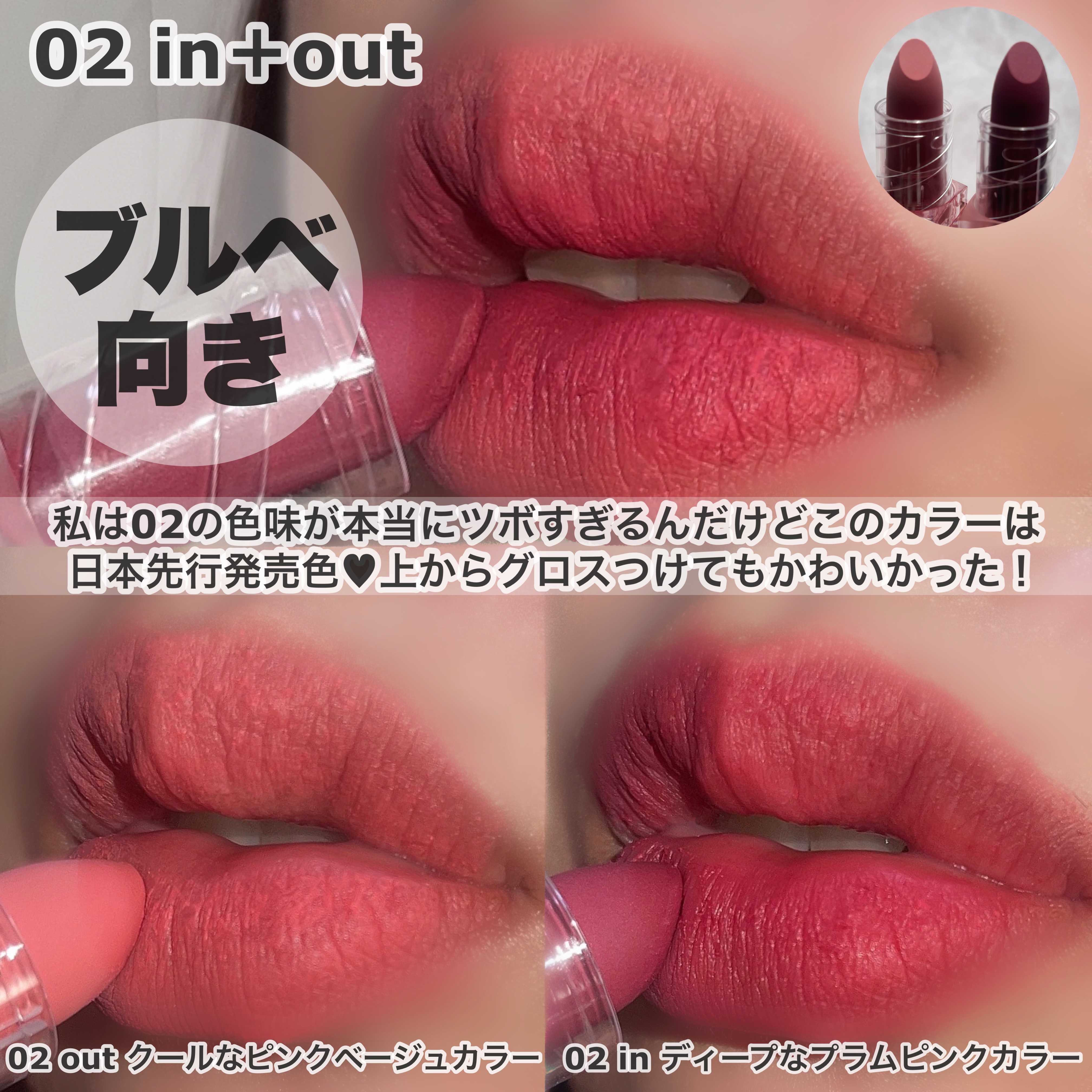 - in+outカラーの組み合わせであなただけのグラデーションカラーを実現。セミマットな質感でふわっとやわらかい印象のリップ。1色で塗っても可愛いカラーバリエーションを揃えました。 2023年6月10日(土)よりPLAZA(一部店舗を除く)にて先行販売開始 01 イン 落ち着いたローズカラー 01 アウト コーラルベージュカラー 02 イン ディープなプラムピンクカラー 02 アウト クールなピンクベージュカラー 03 イン 重くない爽やかなドライローズカラー 03 アウト ヌードトーンのベージュブラウンカラー