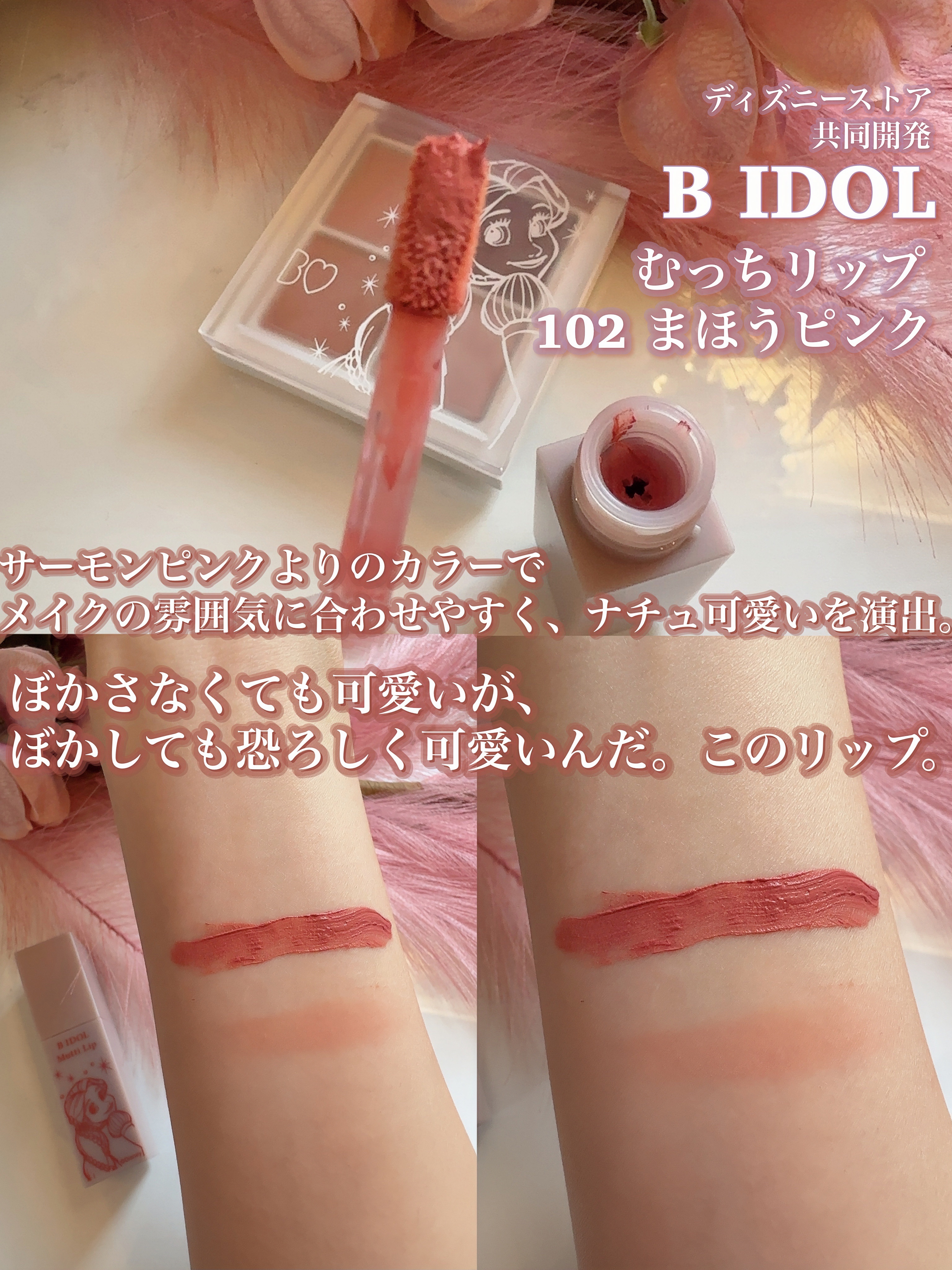 🩷bidolむっちリップ102まほうピンク🩷雲みたいなふわふわ質感のリップで、唇もふわふわむっちりに仕上がります!ティント処方で色持ち、落ちにくさはそこそこあります☺️ですがコップなどには結構付きます😂こちらはディズニーストアとのコラボカラー...