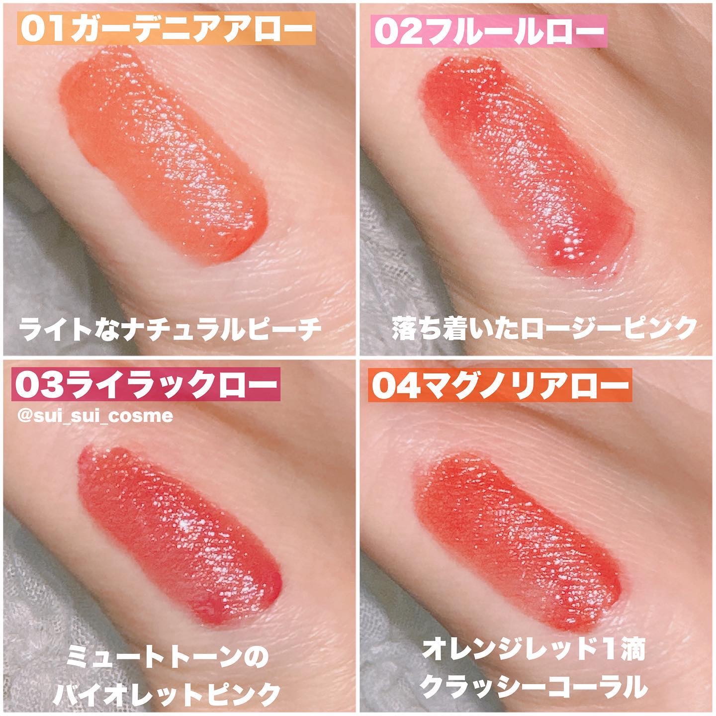 - <01 ガーデニア・ロー> 水、ジフェニルジメチコン、ビスジグリセリルポリアシルアジペート-2、リンゴ酸ジイソステアリル、グリセリン、DPG、セチルPEG/PPG-10/1ジメチコン、1,2-ヘキサンジオール、ポリソルベート60、イソステアリン酸ソルビタン、(アクリル酸ヒドロキシエチル/アクリロイルジメチルタウリンNa)コポリマー、セテアレス-20、スクワラン、酸化チタン、黄5、香料、エチルヘキシルグリセリン、赤227、青1、BG、ヤマザクラ花エキス、モクレン花エキス、ハス花エキス、ダマスクバラ花エキス、クエン酸Na、テトラ(ジ-t-ブチルヒドロキシヒドロケイヒ酸)ペンタエリスリチル、クエン酸、フェノキシエタノール <02 フルール・ロー> 水、ジフェニルジメチコン、ビスジグリセリルポリアシルアジペート-2、リンゴ酸ジイソステアリル、グリセリン、DPG、セチルPEG/PPG-10/1ジメチコン、1,2-ヘキサンジオール、ポリソルベート60、イソステアリン酸ソルビタン、(アクリル酸ヒドロキシエチル/アクリロイルジメチルタウリンNa)コポリマー、セテアレス-20、スクワラン、酸化チタン、香料、エチルヘキシルグリセリン、赤227、黄4、黄5、赤104(1)、青1、BG、ヤマザクラ花エキス、モクレン花エキス、ハス花エキス、ダマスクバラ花エキス、クエン酸Na、テトラ(ジ-t-ブチルヒドロキシヒドロケイヒ酸)ペンタエリスリチル、クエン酸、フェノキシエタノール <03 ライラック・ロー> 水、ジフェニルジメチコン、ビスジグリセリルポリアシルアジペート-2、リンゴ酸ジイソステアリル、グリセリン、DPG、セチルPEG/PPG-10/1ジメチコン、1,2-ヘキサンジオール、ポリソルベート60、イソステアリン酸ソルビタン、(アクリル酸ヒドロキシエチル/アクリロイルジメチルタウリンNa)コポリマー、セテアレス-20、スクワラン、酸化チタン、香料、エチルヘキシルグリセリン、赤227、黄5、青1、BG、ヤマザクラ花エキス、モクレン花エキス、ハス花エキス、ダマスクバラ花エキス、クエン酸Na、テトラ(ジ-t-ブチルヒドロキシヒドロケイヒ酸)ペンタエリスリチル、クエン酸、フェノキシエタノール <04 マグノリア・ロー> 水、ジフェニルジメチコン、ビスジグリセリルポリアシルアジペート-2、リンゴ酸ジイソステアリル、グリセリン、DPG、セチルPEG/PPG-10/1ジメチコン、1,2-ヘキサンジオール、ポリソルベート60、イソステアリン酸ソルビタン、(アクリル酸ヒドロキシエチル/アクリロイルジメチルタウリンNa)コポリマー、セテアレス-20、スクワラン、酸化チタン、香料、エチルヘキシルグリセリン、赤227、黄4、黄5、青1、BG、ヤマザクラ花エキス、モクレン花エキス、ハス花エキス、ダマスクバラ花エキス、クエン酸Na、テトラ(ジ-t-ブチルヒドロキシヒドロケイヒ酸)ペンタエリスリチル、クエン酸、フェノキシエタノール <05 ピオニー・ロー> 水、ジフェニルジメチコン、ビスジグリセリルポリアシルアジペート-2、リンゴ酸ジイソステアリル、グリセリン、DPG、セチルPEG/PPG-10/1ジメチコン、1,2-ヘキサンジオール、ポリソルベート60、イソステアリン酸ソルビタン、(アクリル酸ヒドロキシエチル/アクリロイルジメチルタウリンNa)コポリマー、セテアレス-20、スクワラン、香料、エチルヘキシルグリセリン、黄5、赤227、赤104(1)、BG、ヤマザクラ花エキス、モクレン花エキス、ハス花エキス、ダマスクバラ花エキス、クエン酸Na、テトラ(ジ-t-ブチルヒドロキシヒドロケイヒ酸)ペンタエリスリチル、クエン酸、フェノキシエタノール <06 ピンク・ロー> 水、ジフェニルジメチコン、ビスジグリセリルポリアシルアジペート-2、リンゴ酸ジイソステアリル、グリセリン、DPG、セチルPEG/PPG-10/1ジメチコン、1,2-ヘキサンジオール、ポリソルベート60、イソステアリン酸ソルビタン、(アクリル酸ヒドロキシエチル/アクリロイルジメチルタウリンNa)コポリマー、セテアレス-20、スクワラン、酸化チタン、香料、エチルヘキシルグリセリン、黄5、赤104(1)、赤227、青1、BG、ヤマザクラ花エキス、モクレン花エキス、ハス花エキス、ダマスクバラ花エキス、クエン酸Na、テトラ(ジ-t-ブチルヒドロキシヒドロケイヒ酸)ペンタエリスリチル、クエン酸、フェノキシエタノール <07 ピーチ・ロー> 水、ジフェニルジメチコン、ビスジグリセリルポリアシルアジペート-2、リンゴ酸ジイソステアリル、グリセリン、DPG、セチルPEG/PPG-10/1ジメチコン、1,2-ヘキサンジオール、ポリソルベート60、イソステアリン酸ソルビタン、(アクリル酸ヒドロキシエチル/アクリロイルジメチルタウリンNa)コポリマー、セテアレス-20、スクワラン、酸化チタン、香料、エチルヘキシルグリセリン、黄4、赤227、黄5、赤104(1)、BG、ヤマザクラ花エキス、モクレン花エキス、ハス花エキス、ダマスクバラ花エキス、クエン酸Na、テトラ(ジ-t-ブチルヒドロキシヒドロケイヒ酸)ペンタエリスリチル、クエン酸、フェノキシエタノール <08 スイート・ロー> 水、ジフェニルジメチコン、ビスジグリセリルポリアシルアジペート-2、リンゴ酸ジイソステア