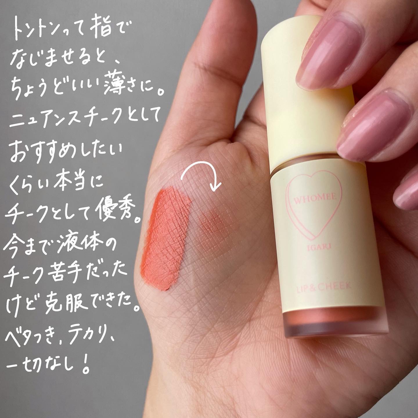 - ふんわりムースな塗り心地 キュンと色付くセミマット仕上げのリップ&チーク ①リップにもチークにも使えるアイテム リップとチークを同じ色にすることで、イガリの骨格理論に基づいた統一感のあるメイクが仕上がる どんな肌色にも似合う、唇にも頬にも使いやすい血色カラー※ ※メークアップ効果による ② ふんわりムースな塗り心地 ムースタッチの軽い付け心地で、ツヤとマットのいいとこどりな仕上がりに。 テクニックいらずで伸ばしやすく、リップ&チーク初心者さんにも使いやすいテクスチャー ③ ヨレにくい※処方でつけたてキープ 高発色で塗布後もヨレにくくつけたてをキープ※ ※自社調べ ④ 温かみのあるリッチなツヤ感 パールを高配合してベルベットのようなリッチで温かみのあるツヤ感 ⑤ イガリこだわりの容器デザイン WHOMEE初のベビーイエローのマットな質感の容器 セミマットさを演出し、遊び心のあるパッケージ