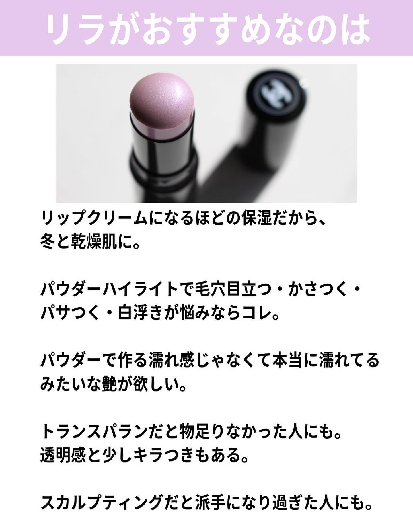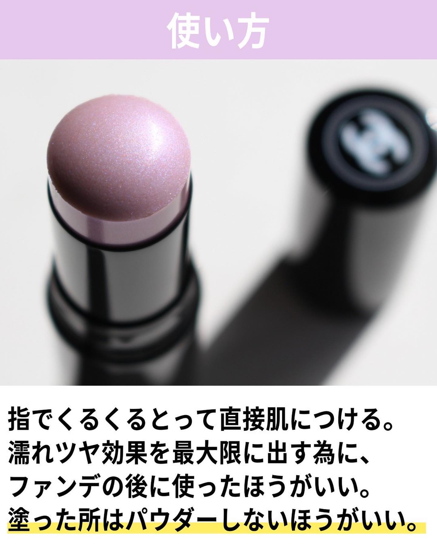 やっぱり最強で圧倒的な可愛さ🤍 今やいろんなブランドから出ている濡れ艶系のスティックハイライトですが、シャネルが火付け役と言っても良いですよね。 圧倒的な濡れ艶で、最強の可愛さ🥹 ラメやパールで作るハイライトとは違い、頬が水分たっぷり含んだような濡れ艶で、上品かつ高級なお肌に。 冬の乾燥してきた時も、持ち歩いておいてお直しで足すと水分プリプリ濡れ艶肌を復活できるので、出る前に使ってもよし、お出かけ先で使ってるのもよしです。