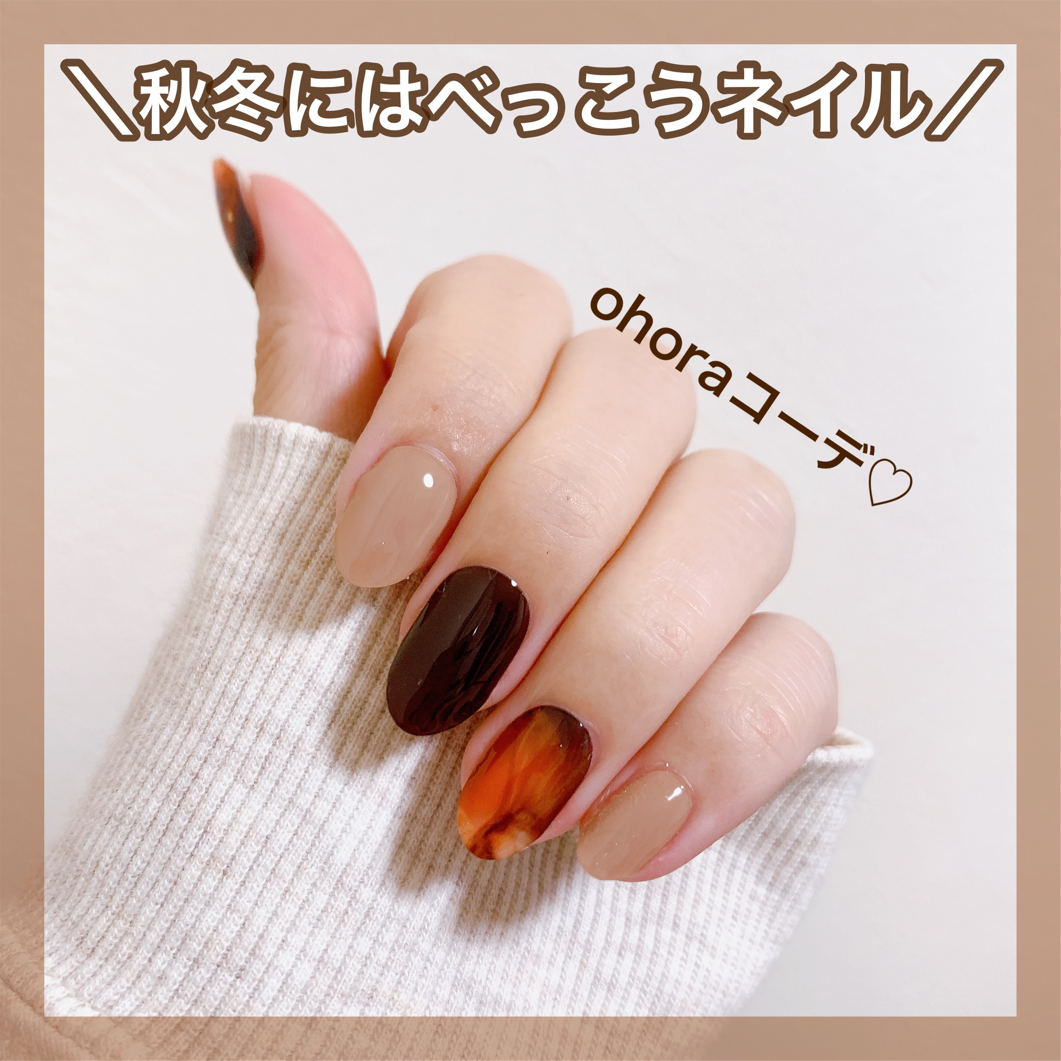 \秋っぽネイル💅/『ohora』 #提供今回は秋先取りデザイン🍂またまた👶🏻お昼寝中に完了✌️ぷっくりツヤツヤ✨ やっぱり爪が綺麗だとワクワク♡『ohora』はセミキュアジェル。液状のジェルネイル100%のうち約60%だけ硬化したジェルネイル...
