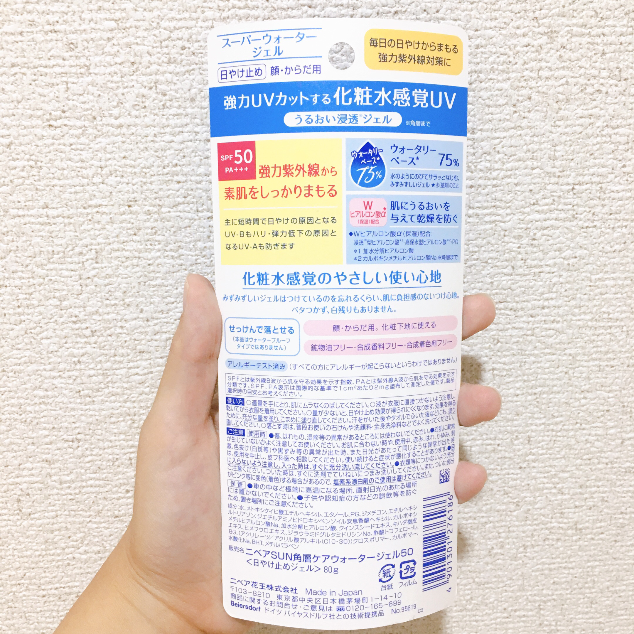 ニベアUVウォータージェル<顔・からだ用>ポンプ 140g ¥1,303〜SPF50/PA+++軽いつけ心地でベタつきにくいウォータリーベース75%のスキンケアUV化粧水と乳液の間くらいのテクスチャー鉱物油フリー・合成香料フリー・合成着色剤フ...