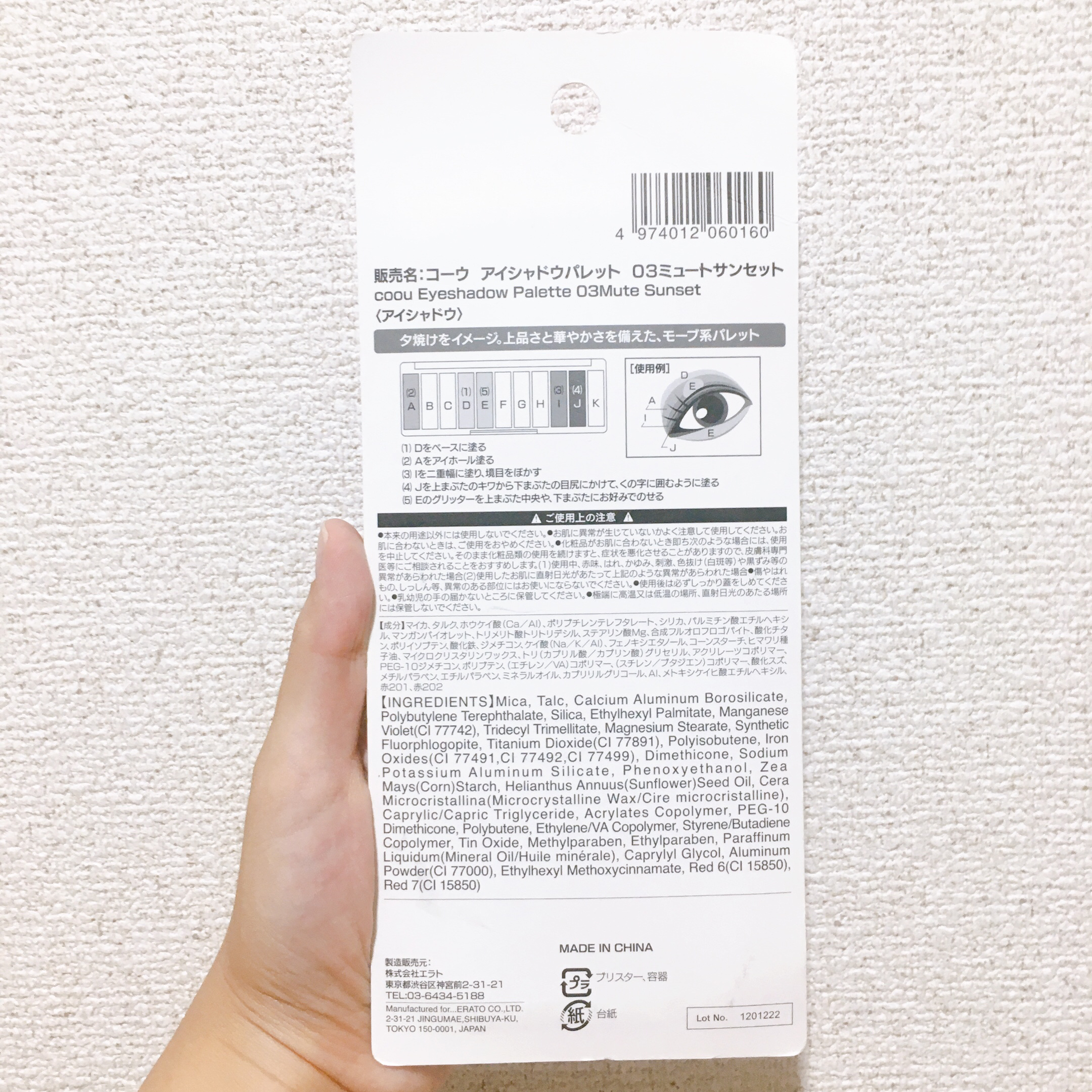 - <02 ドライブーケ> マイカ、タルク、ホウケイ酸(Ca/Al)、マンガンバイオレット、ポリブチレンテレフタレート、パルミチン酸エチルヘキシル、シリカ、ステアリン酸Mg、合成フルオロフロゴパイト、トリメリト酸トリトリデシル、ジメチコン、ポリイソブテン、酸化鉄、酸化チタン、コーンスターチ、ケイ酸(Na/K/Al)、フェノキシエタノール、ヒマワリ種子油、アクリレーツコポリマー、マイクロクリスタリンワックス、トリ(カプリル酸/カプリン酸)グリセリル、PEG-10ジメチコン、(エチレン/VA)コポリマー、ポリブテン、(スチレン/ブタジエン)コポリマー、酸化スズ、メチルパラベン、エチルパラベン、赤201、カプリリルグリコール、ミネラルオイル、Al、メトキシケイヒ酸エチルヘキシル、赤202、黄4 <03 ミュートサンセット> マイカ、タルク、ホウケイ酸(Ca/Al)、ポリブチレンテレフタレート、シリカ、パルミチン酸エチルヘキシル、マンガンバイオレット、トリメリト酸トリトリデシル、ステアリン酸Mg、合成フルオロフロゴパイト、酸化チタン、ポリイソブテン、酸化鉄、ジメチコン、ケイ酸(Na/K/Al)、フェノキシエタノール、コーンスターチ、ヒマワリ種子油、マイクロクリスタリンワックス、トリ(カプリル酸/カプリン酸)グリセリル、アクリレーツコポリマー、PEG-10ジメチコン、ポリブテン、(エチレン/VA)コポリマー、(スチレン/ブタジエン)コポリマー、酸化スズ、メチルパラベン、エチルパラベン、ミネラルオイル、カプリリルグリコール、Al、メトキシケイヒ酸エチルヘキシル、赤201、赤202 <04 ライクピスタチオ> マイカ、タルク、シリカ、合成フルオロフロゴパイト、ホウケイ酸(Ca/Al)、酸化鉄、ステアリン酸Mg、トリメリト酸トリトリデシル、パルミチン酸エチルヘキシル、マンガンバイオレット、ジメチコン、ケイ酸(Na/K/Al)、酸化チタン、PEG-10ジメチコン、コーンスターチ、フェノキシエタノール、ポリブテン、メチルパラベン、エチルパラベン、青1、ミネラルオイル、酸化スズ、赤201