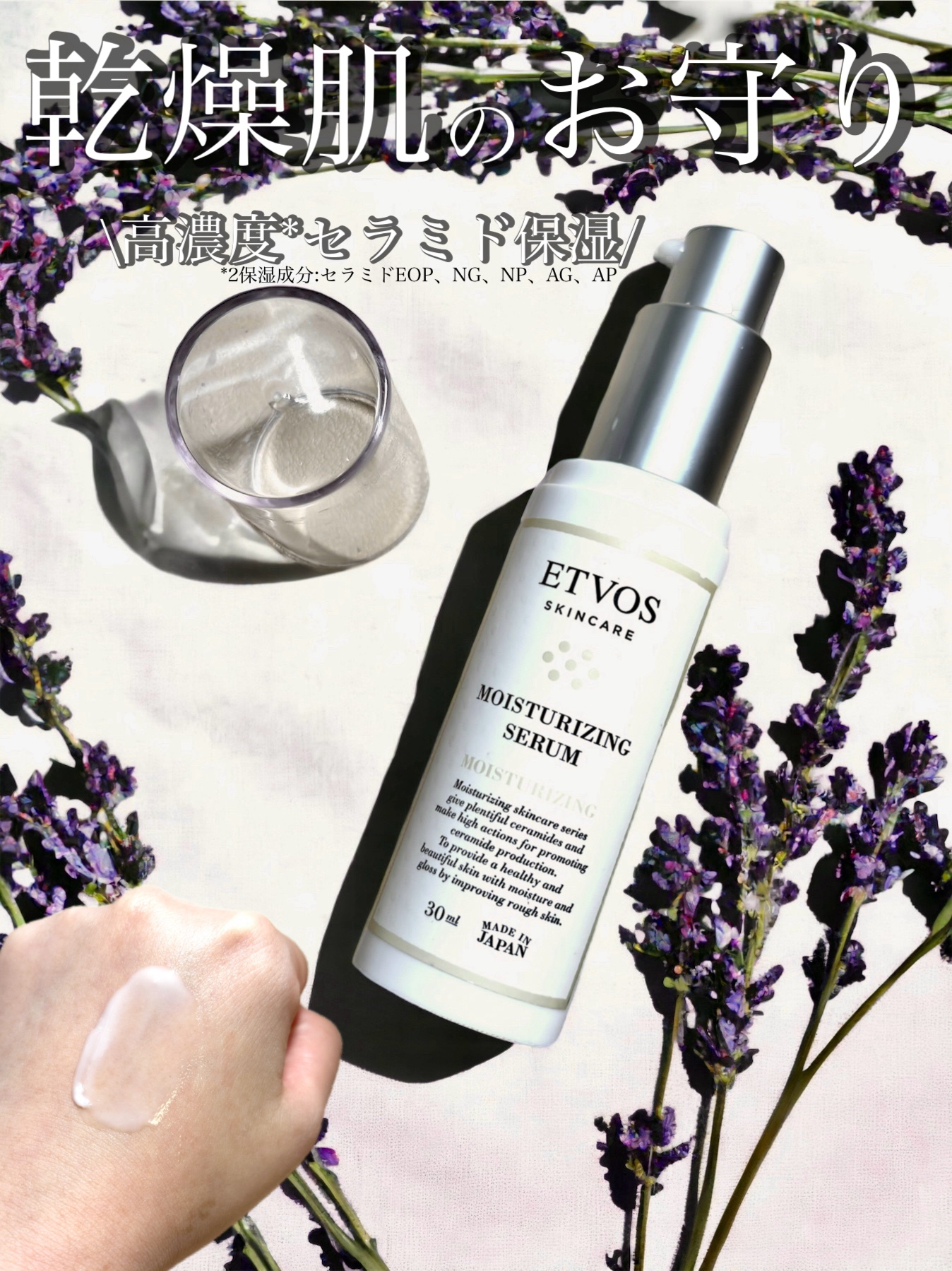 - 敏感肌・乾燥肌・インナードライ肌のために、肌のバリアのことを第一に考えて作られた、1 本で美容液+乳液を叶える、エトヴォス 1 番人気の保湿美容液。 うるおいに満ちたすこやかな肌のために必要不可欠な保湿成分セラミド。モイスチャライジングセラムでは 5 種のヒト型セラミド*を人の肌に存在するセラミドと同じ構造でバランス良く配合。 天然保湿因子(NMF)であるアミノ酸が角層のすみずみまで浸透し、うるおいバリアを整え、不安定に傾きがちなお肌を濃密なうるおいで満たします。 キメを整え、乾燥などの刺激を受けにくい健やかな肌へ導きます。 天然ラベンダー花水の穏やかで落ち着く香り。 [7つの不使用] 石油系界面活性剤、鉱物油、シリコン、着色料、合成香料、パラベン、アルコール *保湿成分:セラミドEOP,NG,NP,AG,AP