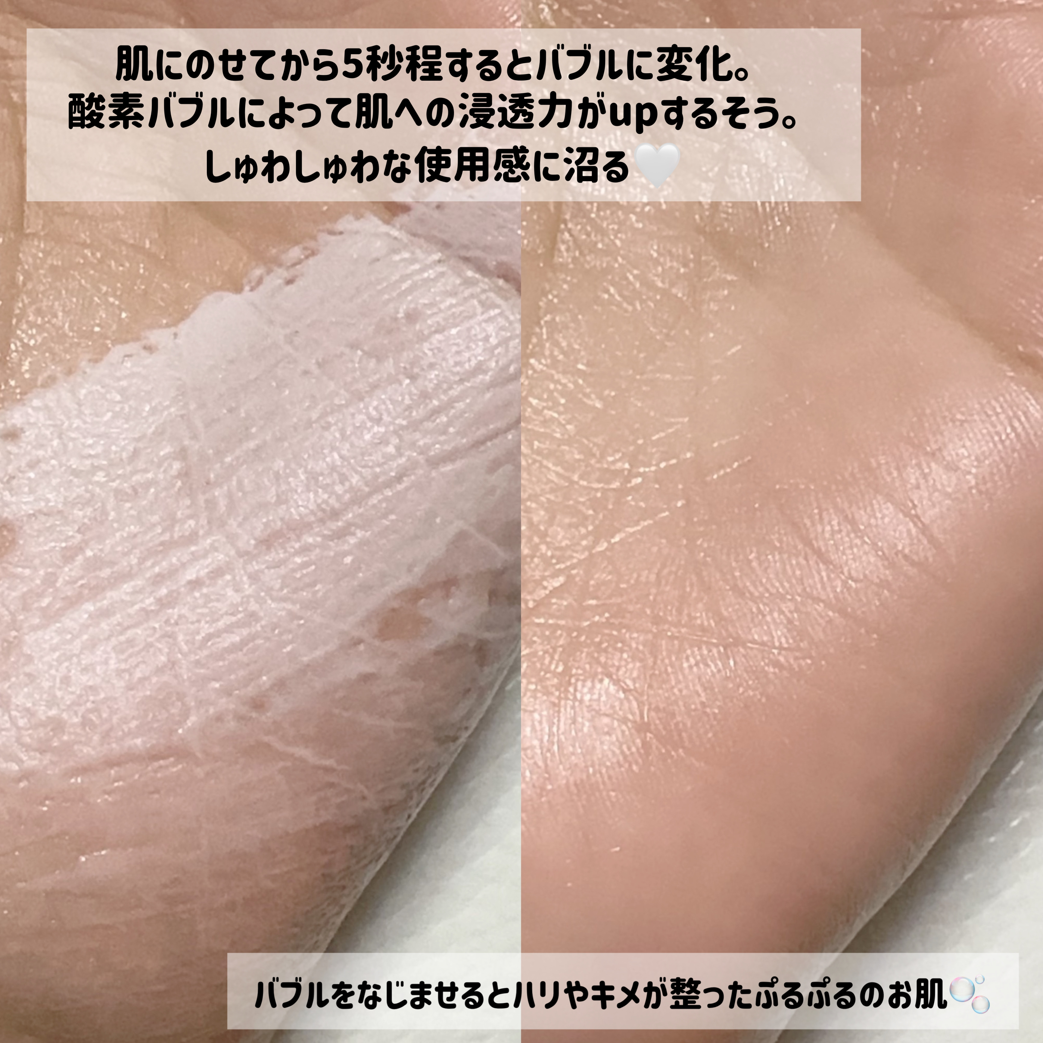 | 柔らかい乳液のようなテクスチャーのエッセンスをお肌に塗ると、たちまちしゅわしゅわと泡が出る…!! | 詳細を見る | |||