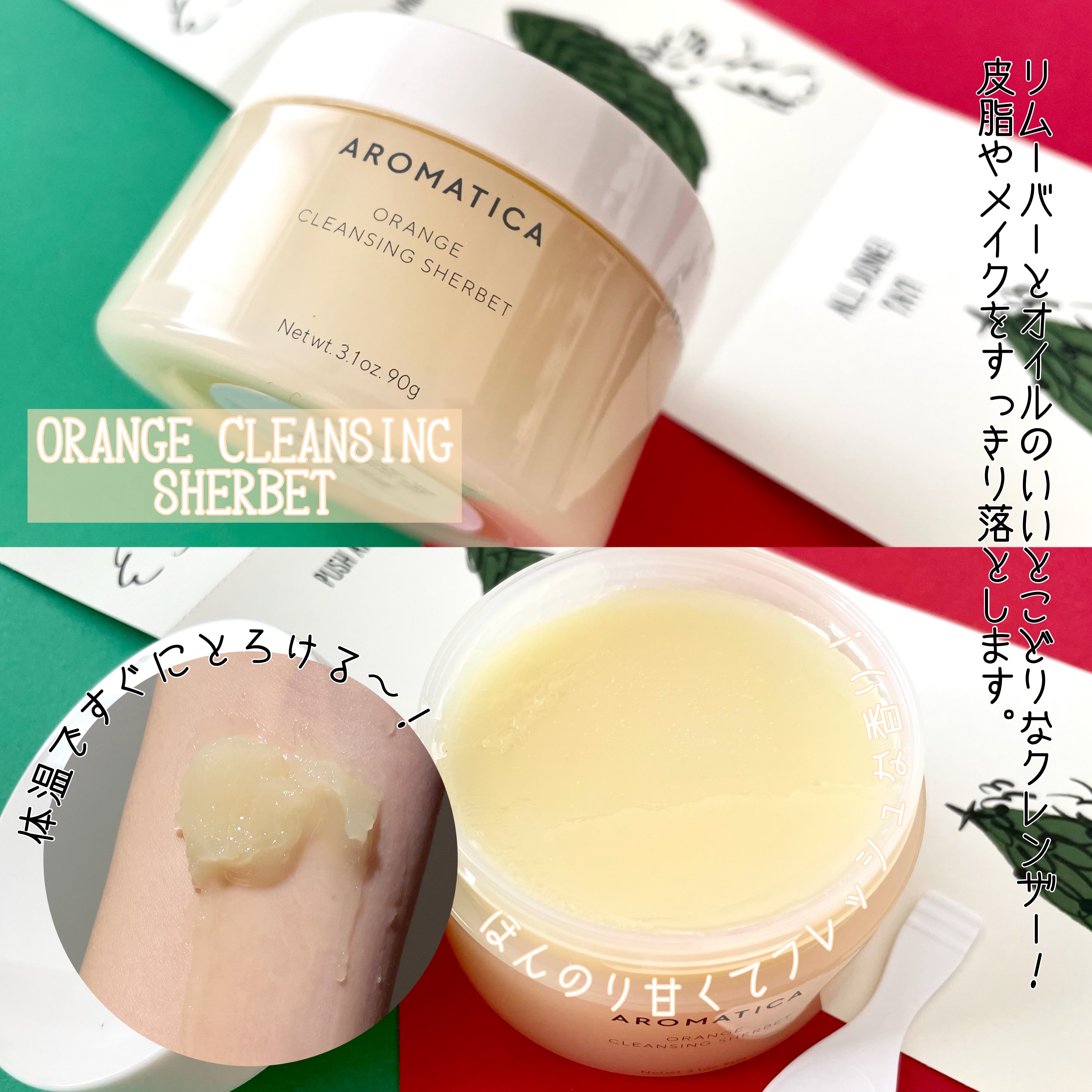@aromatica.jp様より、オレンジクレンジングシャーベットをいただきました。たっぷり入ったジャータイプ。オレンジシャーベットみたい!テクスチャーもシャーベットみたいで、使うのが楽しいです。肌の上でとろけて、優しくメイクになじませること...