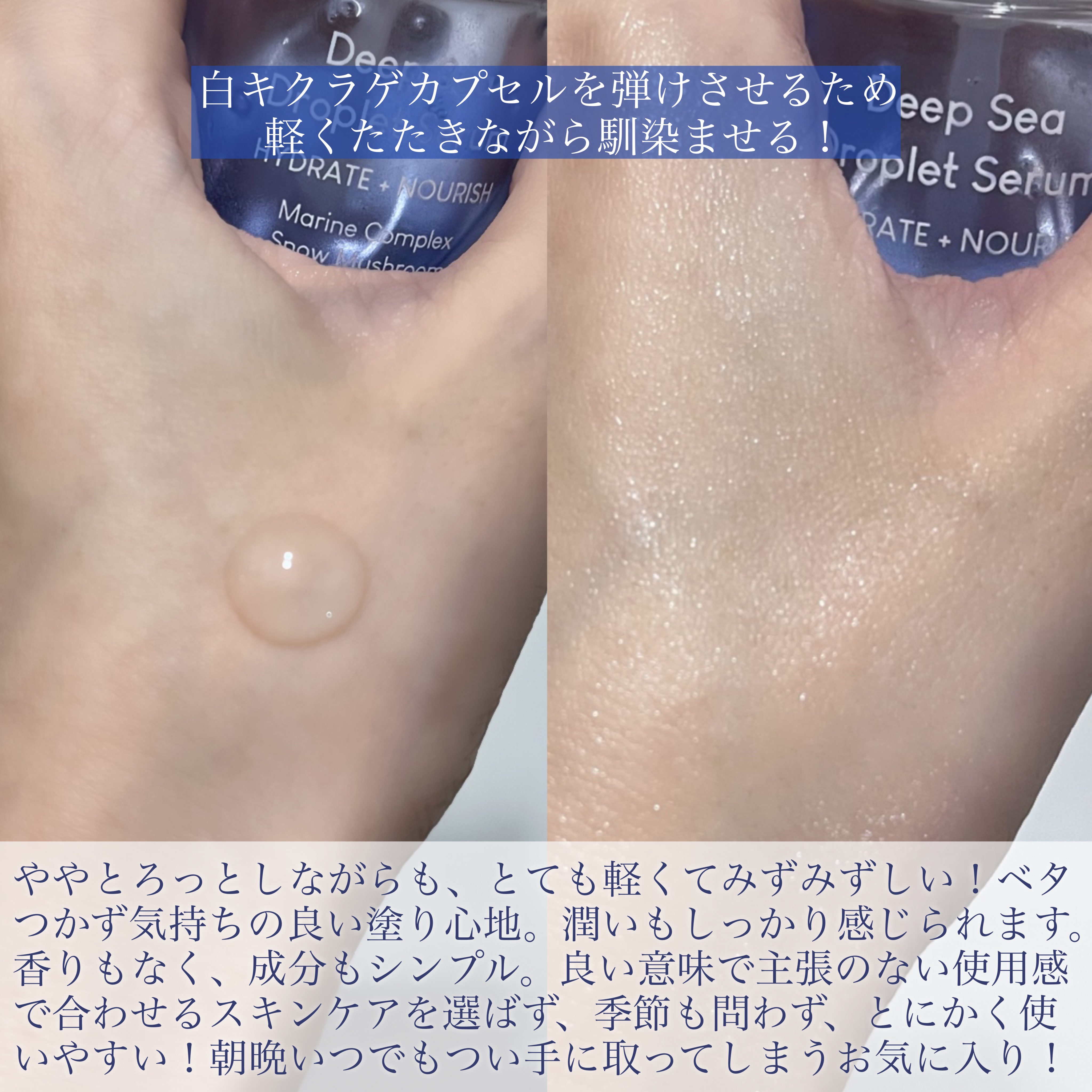 海洋深層水66.01%、MarineComplex、高保湿の白いキクラゲカプセルなど様々な海洋成分を独自にブレンドされた美容液。 水分としっとりとしたツヤを与え、水分量を高めてバランスを保ってくれるそうです🫧 みずみずしいウォータリーテクスチャーで肌にあっという間に馴染んで、しっとりするような使用感♡ ベタつきもなく肌質問わず使えそうな印象です! また、海を連想させるようなブルーのグラデーションが、とても綺麗なパッケージも魅力のひとつです🫧