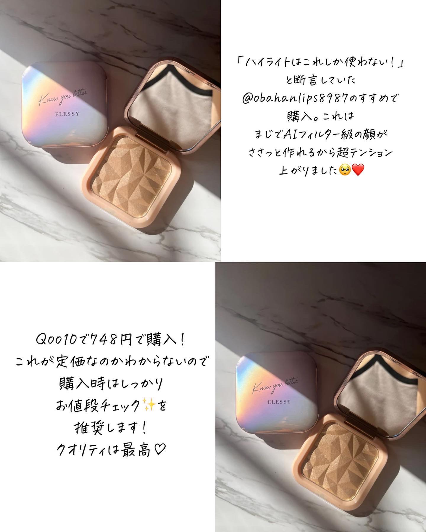 かっっっっわいすぎるキラキラのハイライト✨ 001 シャンパンゴールドは肌馴染みの良いカラー。 ラメたっぷりだけど主張し過ぎないので 自然な艶肌&立体感を創り出してくれます! オーロラカラーのパッケージがテンションあがる💘 毎日使うたびにワクワクするアイテム。