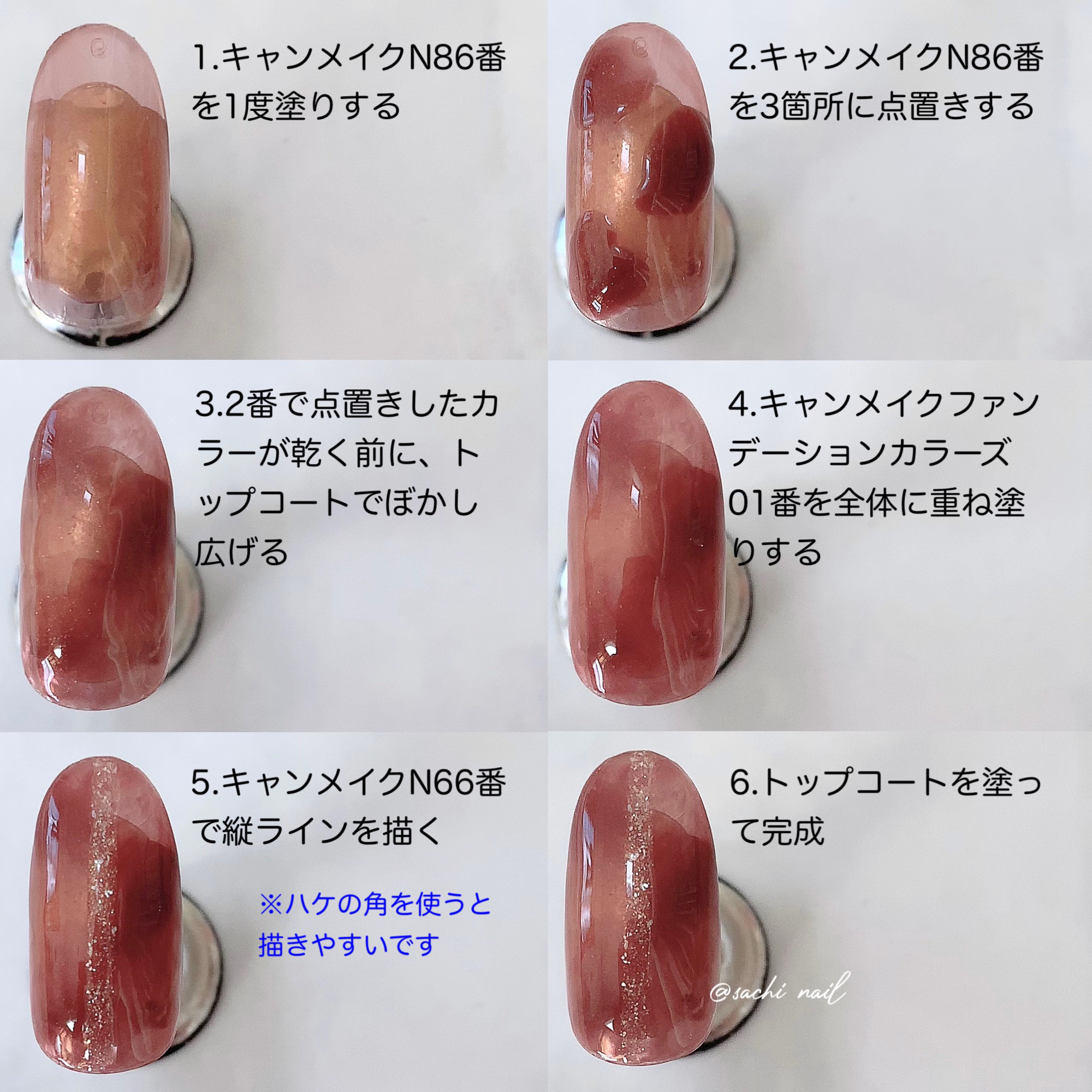 ワンカラーでも指ごとに色を変えるだけでオシャレに見えます💕 画像のようにゴールドラインとストーンを少し足すだけで華やかさがアップ🥰 何度かご紹介したことのあるスポンジで作るグラデーションです✨ スポンジを使うことで境目が綺麗に馴染んでくれます💕 アルミホイルの上でブラウンとトップコートを1:1くらいで混ぜたものを、トップコートのハケに取って3箇所に塗るだけ👌 事前に混ぜたものを塗ることで、爪の上でぼかすより簡単に出来ます💕 ベースカラーが乾く前に点置きしてぼかすことで綺麗にぼかせます✨ スピードが大事なので、使うポリッシュのキャップは全て開けておきましょう😊 天然石のラインはガタガタの方がより天然石っぽく見えるので、ラインを描くのが苦手な方でも大丈夫🙆♀️ 難しそうに見えて、やってみると意外と簡単に出来ます♡
