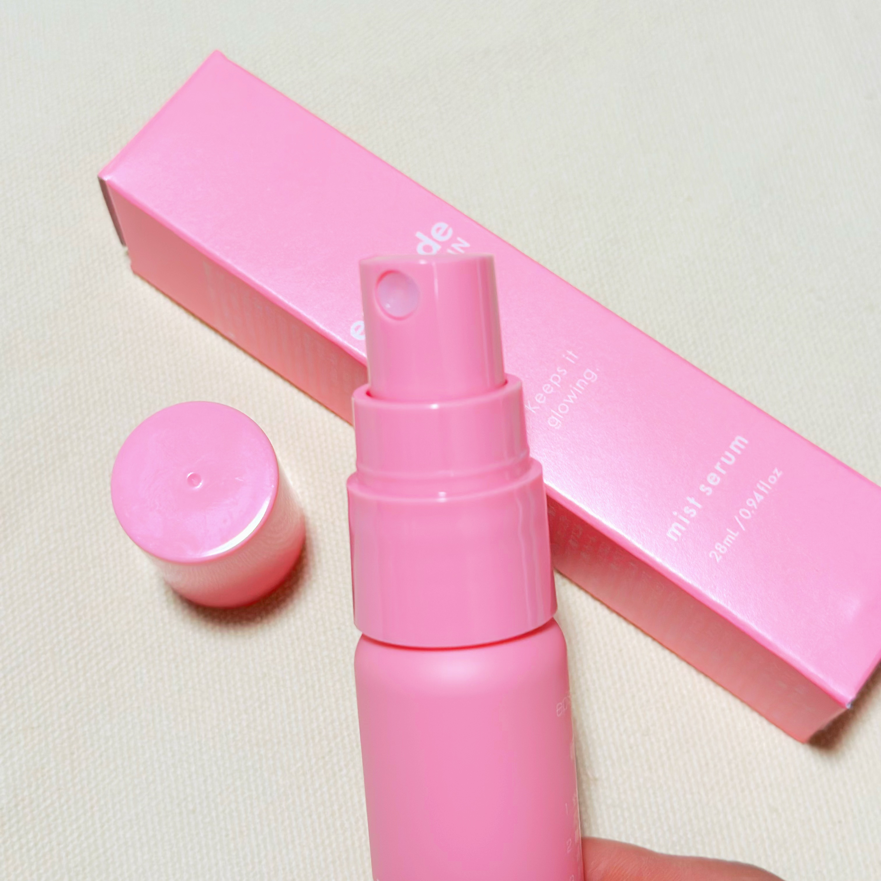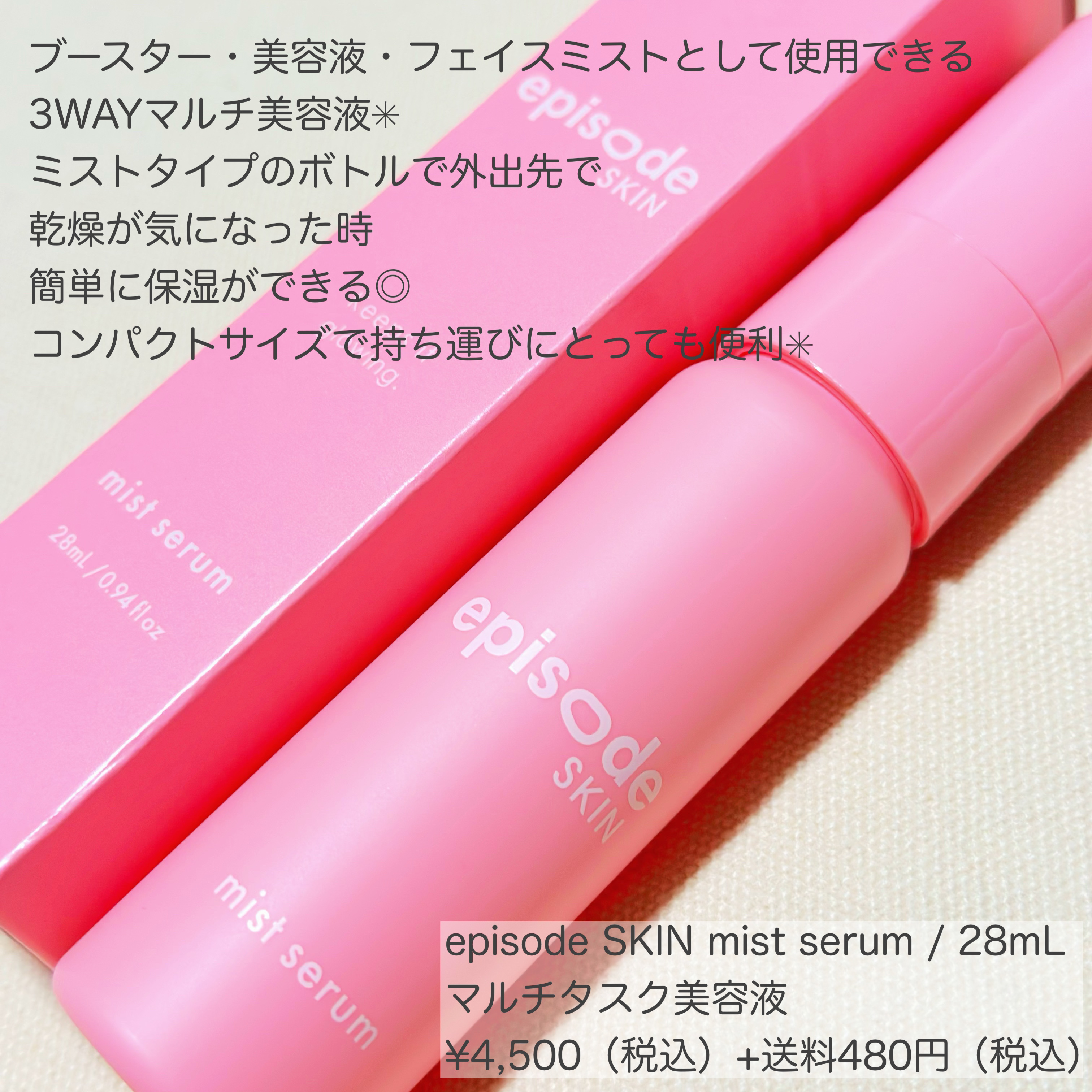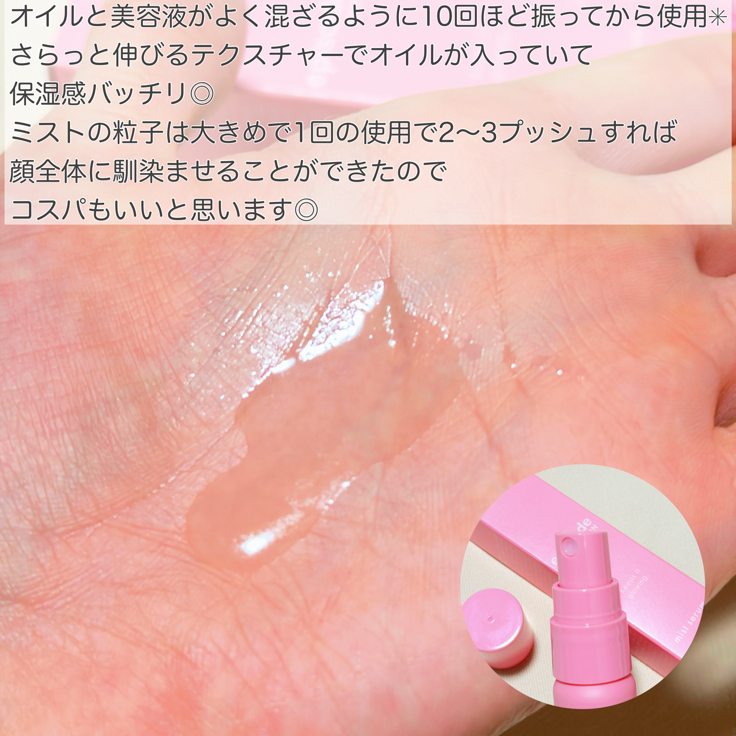 ミストセラム28ml 4,500円(税込) ブースター、美容液、フェイスミストとして一瞬で保湿ケアできるミストタイプの美容液🫧 パルミチン酸レチノール配合でお肌のキメを整えてくれるよ🌿 粒子が粗め?だからメイクの上からフェイスミストとして使う場合は慎重に! 個人的には、導入美容液として使うのがお気に入り🫧 お肌を保護して角質層まで浸透力を高めてくれる🫶 小さめの容器で持ち運びしやすいしピンクで可愛いパケだからバッグにそのまま入れてても良いし外出先でも手軽に使えるのもおすすめポイント🫙