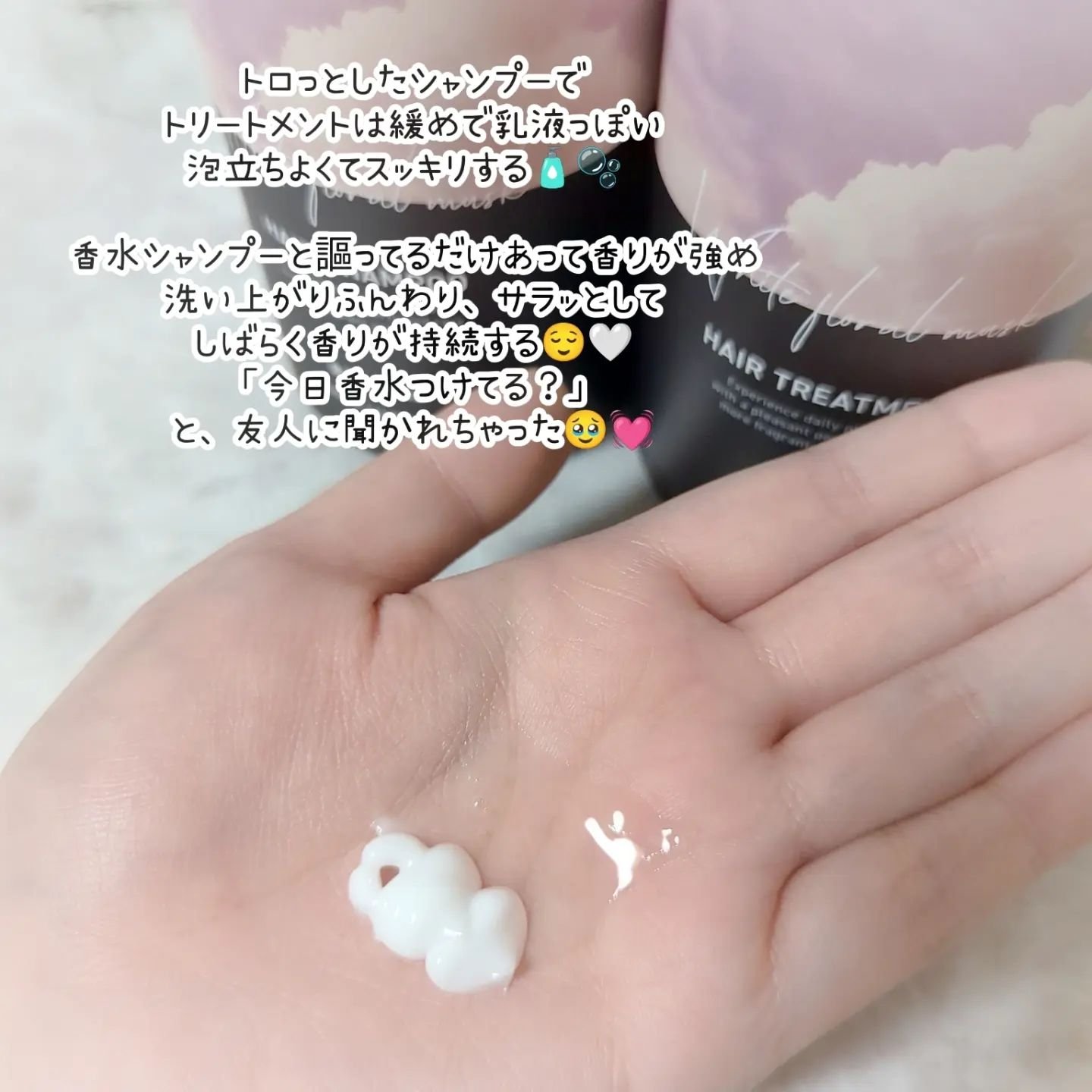 コスパ最強香水シャンプー ★パフュームドヘアケア シャンプー&トリートメント 泡立ちが良くさっと洗い流せてきしみ感なし トリートメントは濃密なテクスチャーで髪に馴染ませやすく ホワイトフローラルムスクの香りを使ってみたけど、華やかさもあり上品ないい香りで
