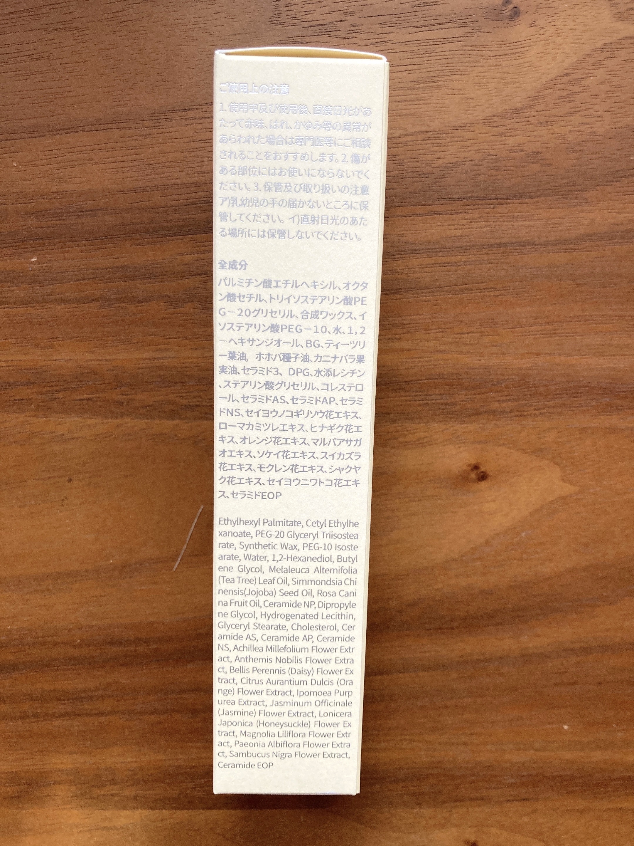 - <本体> パルミチン酸エチルヘキシル、オクタン酸セチル、トリイソステアリン酸PEG-20グリセリル、合成ワックス、イソステアリン酸PEG-10、水、1,2-ヘキサンジオール、BG、ティーツリー葉油、ホホバ種子油、カニナバラ果実油、セラミド3、DPG、水添レシチン、ステアリン酸グリセリル、コレステロール、セラミドAS、セラミドAP、セラミドNS、セイヨウノコギリソウ花エキス、ローマカミツレエキス、ヒナギク花エキス、オレンジ花エキス、マルバアサガオエキス、ソケイ花エキス、スイカズラ花エキス、モクレン花エキス、シャクヤク花エキス、セイヨウニワトコ花エキス、セラミドEOP