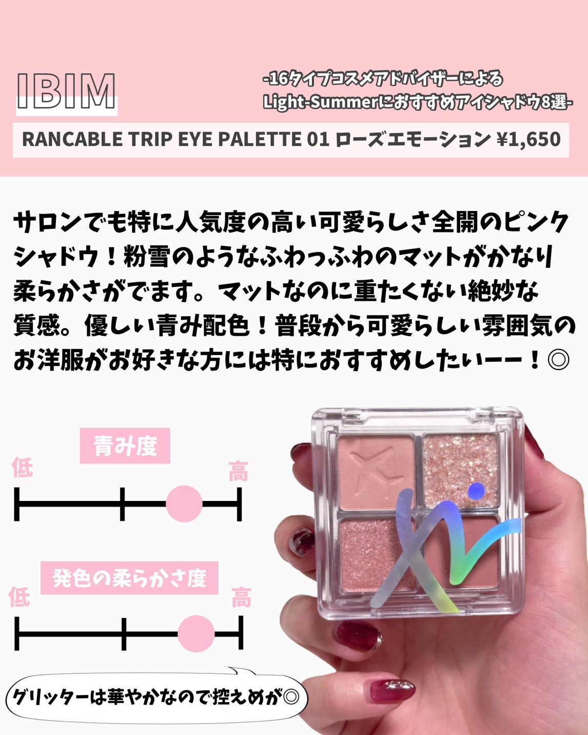 | 3つの異なる質感からなる4色パレットで、使い方によって雰囲気も質感も変わっていきます✨ | 詳細を見る |