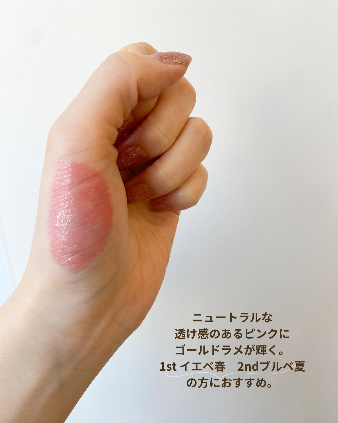 らめがとっても可愛いこのリップは 唇に乗せるとかなりニュートラルな明るいピンクに発色。 2nd ブルベ夏の方や 1st ブルベ夏2nd イエベ春の方におすすめです。 とっても可愛いので是非試してみてください🤍