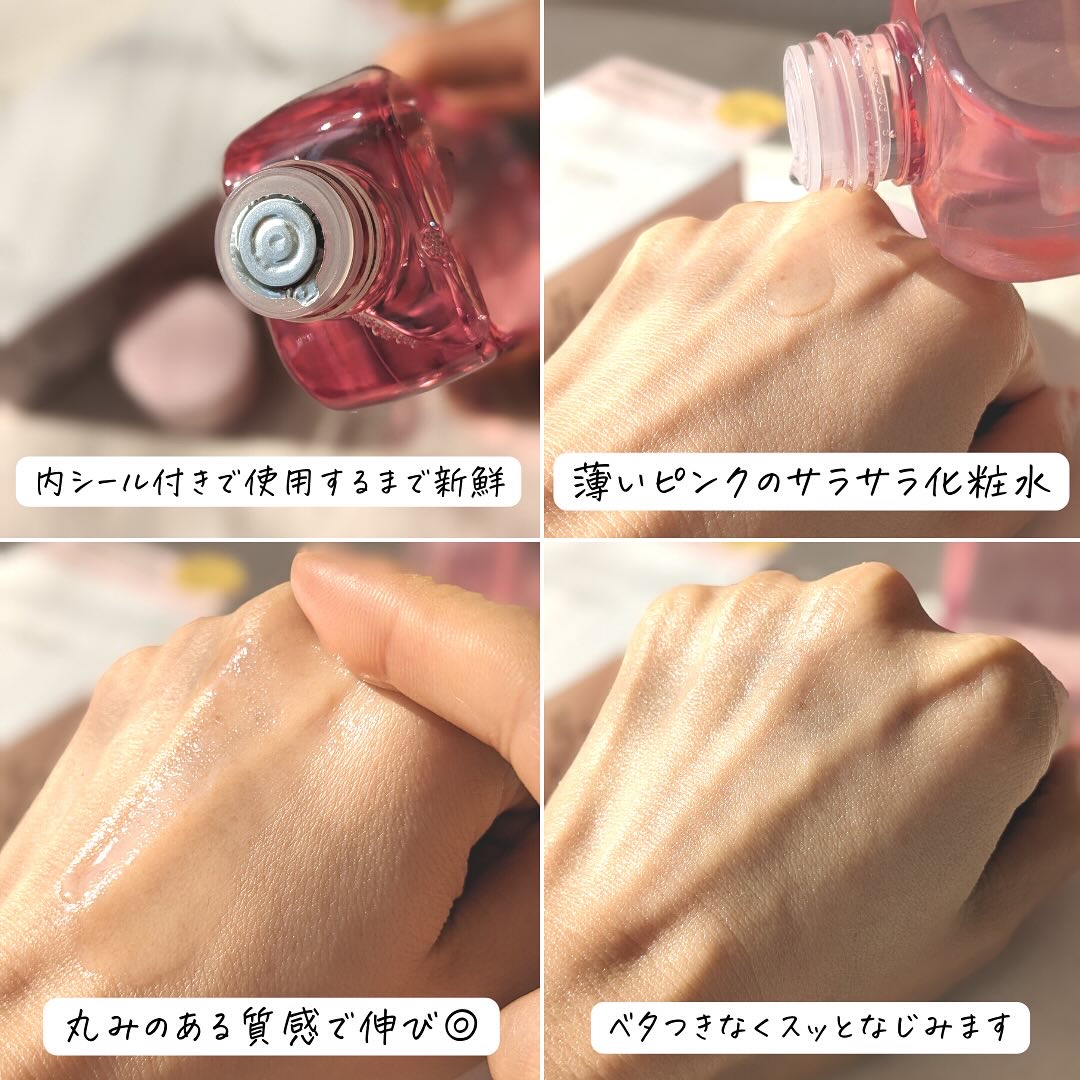 ティーツリーや、シカエキスを配合でニキビ、肌荒れ悩みをケアしてくれるトナー🩷 ピンク色は自然成分「ビタミンB12」本来の色だそう✨ サラサラテクスチャーで、さっぱりした使い心地✨