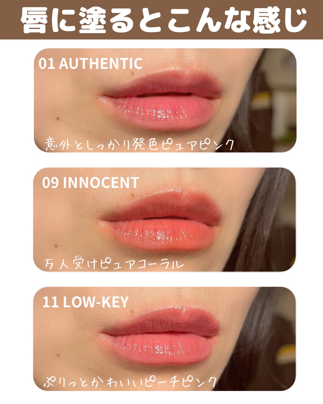 発色はけっこうよくて一度塗りでもしっかり色づく。 色持ちはティントじゃないからそこまでよくはないかな。 ツヤ感、透明感ありでどんなメイクの時にも使いやすい。 唇の血色悪い人はこの透明感で思ってたより発色しないかもしれない。 唇の血色いい人はヴィセの方が合ってそう。