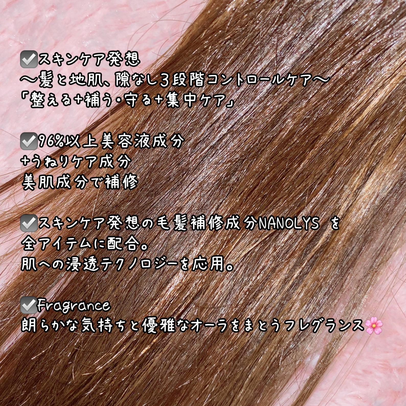 - 「浸透型*1うねり補修成分」※2がうねり・クセを抑え、毛先までまとまる髪へ導く、スキンケア発想の「うねり・クセ」特化型髪質*2コントロール補修ケアブランドです。 *1 毛髪内部への浸透 *2 なめらかさ・うるおい感などの髪の質感のこと ※1 ヒアルロン酸Na、加水分解ヒアルロン酸Na、加水分解ヒアルロン酸、アセチルヒアルロン酸Na、ヒアルロン酸クロスポリマー-2-Na (全て保湿、5つの異なる分子のヒアルロン酸からできた複合成分のこと) ※2 γ-ドコサラクトン、加水分解ケラチン(羊毛)(全て補修) ①スキンケア発想〜髪と地肌、隙なし3段階コントロールケア〜 「整える+補う・守る+集中ケア」 ②96%以上美容液成分*1+うねりケア成分※1 ③【シャンプー】毛穴汚れ除去成分 天然クレイ※2 頭皮の汚れを吸着除去し、健やかで柔らかな地肌に。【トリートメント】湿気ブロック成分※3 毛髪内部のうるおいをキープし、湿気による髪の広がりを抑える。【ヘアオイル】頭皮ケア成分 ホホバオイル※4 地肌と髪の両方に使えるノンシリコン処方。うるおいを与え、湿気&乾燥からガード。【ヘアマスク】濃密「うねり補修セラム」成分※5 傷んだ毛髪内部の水分バランスを整え、うねり・クセを集中ケア。 ④うねり髪に、美肌成分※5で補修 スキンケア発想の毛髪補修成分NANOLYS®︎を全アイテムに配合。肌への浸透テクノロジーを応用。 シャンプー:●毛穴汚れ除去成分 天然クレイ※2 頭皮の汚れを吸着除去し、健やかでやわらかな地肌に。トリートメント:湿気ブロック成分※3 毛髪内部のうるおいをキープし、湿気による髪の広がりを抑制。 *1 基剤を除く、水を含む(シャンプー)/水を含む(ヘアトリートメント・ヘアオイル・ヘアマスク) ※1 γ-ドコサラクトン、加水分解ケラチン(羊毛)(全て補修) ※2 モロッコ溶岩クレイ(汚れ吸着) ※3 ポリクオタニウムー61(保護) ※4 ホホバ種子油(保湿) ※5 加水分解ケラチン(羊毛)、水添レシチン(全て補修)