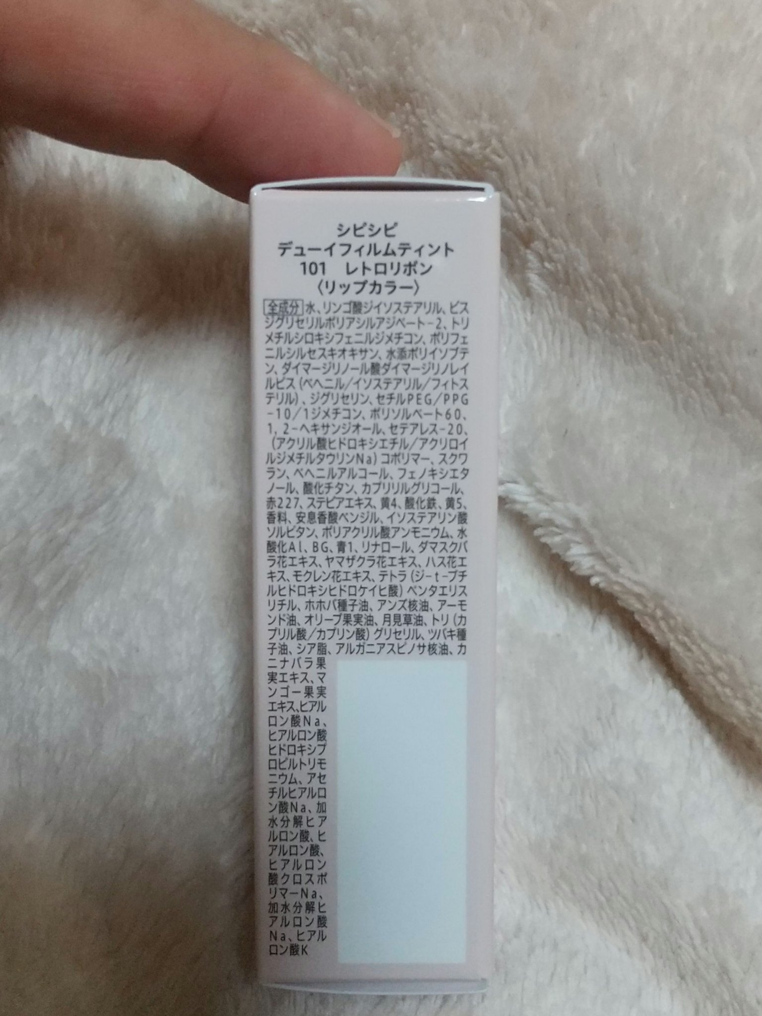 - <01 ひとくせフィグ> 水、リンゴ酸ジイソステアリル、ビスジグリセリルポリアシルアジペート-2、トリメチルシロキシフェニルジメチコン、ダイマージリノール酸ダイマージリノレイルビス(ベヘニル/イソステアリル/フィトステリル)、水添ポリイソブテン、ポリフェニルシルセスキオキサン、ジグリセリン、セチルPEG/PPG-10/1ジメチコン、ポリソルベート60、1,2-ヘキサンジオール、セテアレス-20、(アクリル酸ヒドロキシエチル/アクリロイルジメチルタウリンNa)コポリマー、スクワラン、ベヘニルアルコール、フェノキシエタノール、カプリリルグリコール、ステビアエキス、酸化チタン、酸化鉄、赤227、黄5、香料、安息香酸ベンジル、イソステアリン酸ソルビタン、黄4、ポリアクリル酸アンモニウム、水酸化Al、青1、BG、リナロール、モクレン花エキス、ハス花エキス、ヤマザクラ花エキス、ダマスクバラ花エキス、テトラ(ジ-t-ブチルヒドロキシヒドロケイヒ酸)ペンタエリスリチル、月見草油、オリーブ果実油、シア脂、ツバキ種子油、トリ(カプリル酸/カプリン酸)グリセリル、アルガニアスピノサ核油、ホホバ種子油、アーモンド油、アンズ核油、カニナバラ果実エキス、マンゴー果実エキス、ヒアルロン酸Na、ヒアルロン酸ヒドロキシプロピルトリモニウム、加水分解ヒアルロン酸、アセチルヒアルロン酸Na、ヒアルロン酸、ヒアルロン酸クロスポリマーNa、加水分解ヒアルロン酸Na、ヒアルロン酸K <02 さくらダスティ> 水、リンゴ酸ジイソステアリル、ビスジグリセリルポリアシルアジペート-2、トリメチルシロキシフェニルジメチコン、ダイマージリノール酸ダイマージリノレイルビス(ベヘニル/イソステアリル/フィトステリル)、水添ポリイソブテン、ポリフェニルシルセスキオキサン、ジグリセリン、セチルPEG/PPG-10/1ジメチコン、ポリソルベート60、1,2-ヘキサンジオール、セテアレス-20、(アクリル酸ヒドロキシエチル/アクリロイルジメチルタウリンNa)コポリマー、スクワラン、ベヘニルアルコール、酸化チタン、フェノキシエタノール、カプリリルグリコール、ステビアエキス、香料、黄4、黄5、赤227、安息香酸ベンジル、イソステアリン酸ソルビタン、赤104(1)、水酸化Al、ポリアクリル酸アンモニウム、青1、BG、リナロール、モクレン花エキス、ハス花エキス、ヤマザクラ花エキス、ダマスクバラ花エキス、テトラ(ジ-t-ブチルヒドロキシヒドロケイヒ酸)ペンタエリスリチル、月見草油、オリーブ果実油、シア脂、ツバキ種子油、トリ(カプリル酸/カプリン酸)グリセリル、アルガニアスピノサ核油、ホホバ種子油、アーモンド油、アンズ核油、カニナバラ果実エキス、マンゴー果実エキス、ヒアルロン酸Na、ヒアルロン酸ヒドロキシプロピルトリモニウム、加水分解ヒアルロン酸、アセチルヒアルロン酸Na、ヒアルロン酸、ヒアルロン酸クロスポリマーNa、加水分解ヒアルロン酸Na、ヒアルロン酸K <03 クールガール> 水、リンゴ酸ジイソステアリル、ビスジグリセリルポリアシルアジペート-2、トリメチルシロキシフェニルジメチコン、ダイマージリノール酸ダイマージリノレイルビス(ベヘニル/イソステアリル/フィトステリル)、水添ポリイソブテン、ポリフェニルシルセスキオキサン、ジグリセリン、セチルPEG/PPG-10/1ジメチコン、ポリソルベート60、1,2-ヘキサンジオール、セテアレス-20、(アクリル酸ヒドロキシエチル/アクリロイルジメチルタウリンNa)コポリマー、スクワラン、 ベヘニルアルコール、フェノキシエタノール、カプリリルグリコール、酸化チタン、ステビアエキス、赤227、黄5、赤104(1)、香料、安息香酸ベンジル、黄4、イソステアリン酸ソルビタン、水酸化Al、ポリアクリル酸アンモニウム、青1、BG、リナロール、モクレン花エキス、ハス花エキス、ヤマザクラ花エキス、ダマスクバラ花エキス、テトラ(ジ-t-ブチルヒドロキシヒドロケイヒ酸)ペンタエリスリチル、月見草油、オリーブ果実油、シア脂、ツバキ種子油、トリ(カプリル酸/カプリン酸)グリセリル、アルガニアスピノサ核油、ホホバ種子油、アーモンド油、アンズ核油、カニナバラ果実エキス、マンゴー果実エキス、ヒアルロン酸Na、ヒアルロン酸ヒドロキシプロピルトリモニウム、加水分解ヒアルロン酸、アセチルヒアルロン酸Na、ヒアルロン酸、ヒアルロン酸クロスポリマーNa、加水分解ヒアルロン酸Na、ヒアルロン酸K <04 エモーション> 水、リンゴ酸ジイソステアリル、ビスジグリセリルポリアシルアジペート-2、トリメチルシロキシフェニルジメチコン、ダイマージリノール酸ダイマージリノレイルビス(ベヘニル/イソステアリル/フィトステリル)、水添ポリイソブテン、ポリフェニルシルセスキオキサン、ジグリセリン、セチルPEG/PPG-10/1ジメチコン、ポリソルベート60、1,2-ヘキサンジオール、セテアレス-20、(アクリル酸ヒドロキシエチル/アクリロイルジメチルタウリンNa)コポリマー、スクワラン、 ベヘニルアルコール、フェノキシエタノール、カプリリ