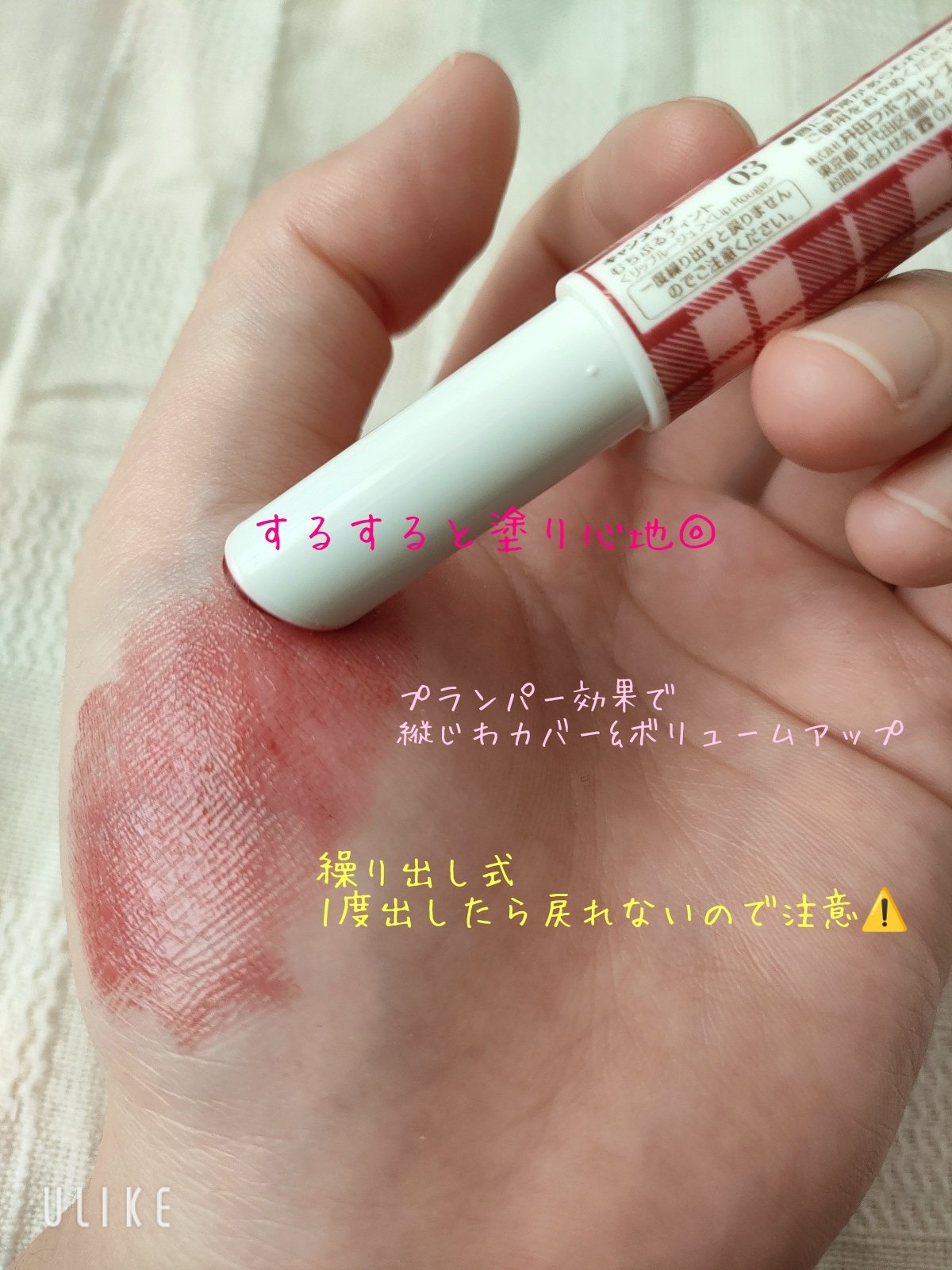 | 口紅・グロス・リップライナーランキング第53位 | めちゃくちゃ塗り心地が軽いのに、色のせてすぐティッシュOFFしても色がめっちゃ残る!! | 詳細を見る |