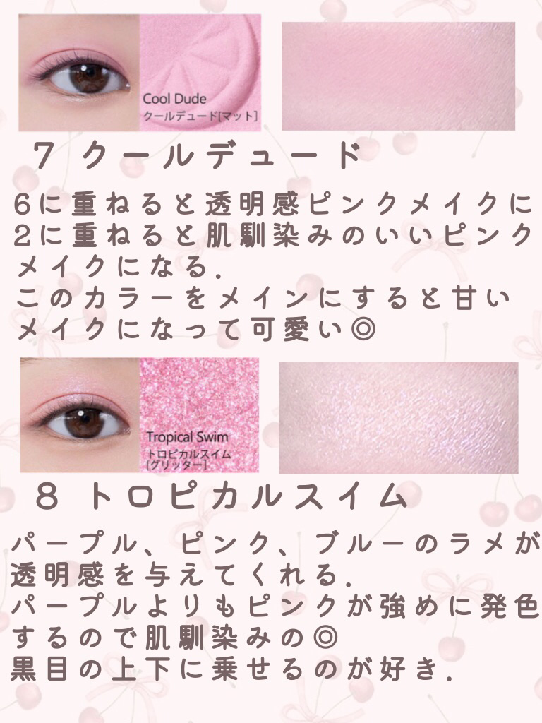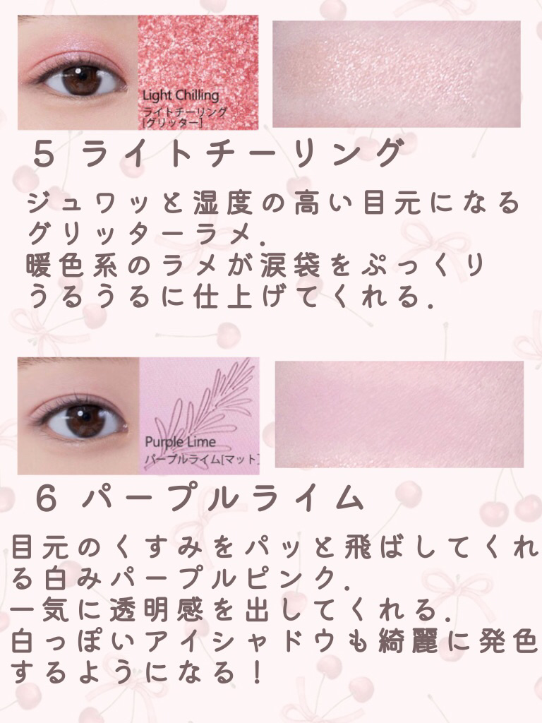 ・マット7色、ラメ1色、シマー1色、グリッター1色 好きな質感に仕上げられるパレットになってます. ・パープルで透明感メイク、ピンクで可愛らしいメイクができます. ・全体的に淡い発色で濃淡の調節がしやすくて、すごく濃いメイクにならない. ・ブラウンが苦手なので締め色が淡いカラーなのが嬉しい. ・パープルは白みとピンクみが強めなのでバブリーにならない. ・瞼のくすみが気になっていたのですが、1のベースカラーを使用すると綺麗にくすみが飛んで気にならなくなった. ・マットが好きなのでマットが多めで嬉しい. ・ラメカラーがどれもかわいい. ・マットは粉飛びするものが多いですが、これはしっとり質感で粉飛びしない. ・なんと言っても全ての色がかわいすぎる!!! ・くすみが苦手な人. ・韓国っぽい白みピンクのメイクがしたい人. ・濃い締め色が苦手な人. ・ラメやシマーで質感を変えて使えるカラーを探して人.