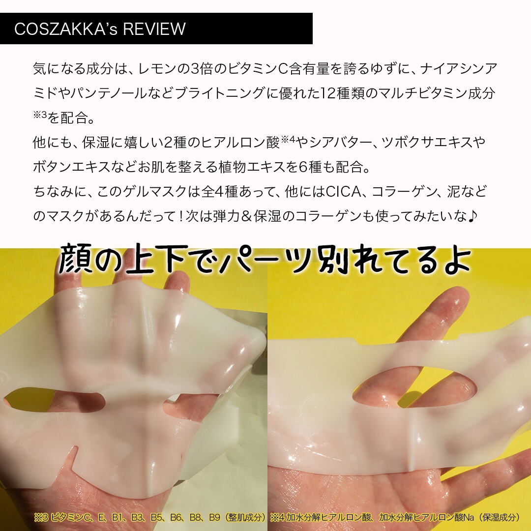 - エッセンスをたっぷり含んだゲル状マスク。 肌にしっかりと密着し、時間が経ってもしっとり感を保つことができます。 ゆずエキス配合で、豊富なビタミンCが透明感のある水光肌へと導きます。