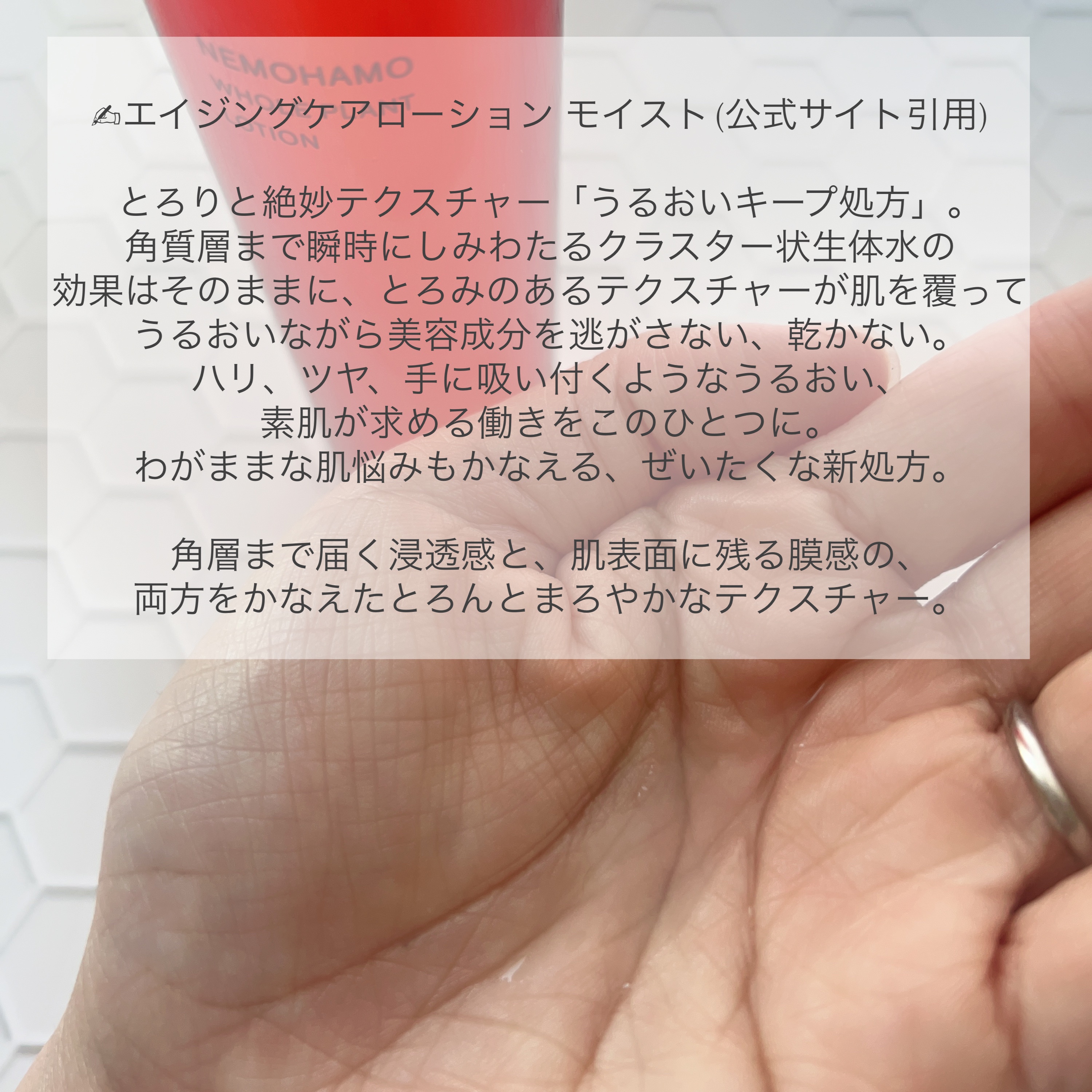 | サラッとした軽やかな テクスチャーで、 すーっと肌に馴染んでいくのが 心地よい♪ | 詳細を見る | ||