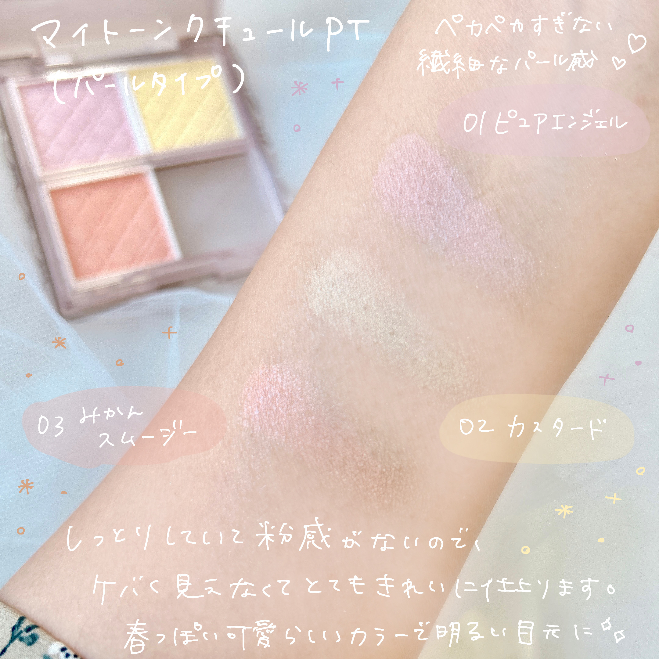 なんとも言えない絶妙なピンク系の3色がそろっていて、技術いらずで自然なグラデーションになります。 ピンクといっても甘々ではなくて落ち着きのある上品なピンク 見た目的に明るい2色はパール感が強くて浮いちゃうかな~?と少し心配でしたが、実際のせてみると、むしろ今までのトーンアップアイシャドウの中ではパール感は控えめかなと思いました。 とてもしっとりした質感で、チップでもブラシでもキレイにのってムラになりくく優秀です🕊 お安いのにカラーも長持ちしてくれるし値段に対してすごく高クオリティです👏🏻