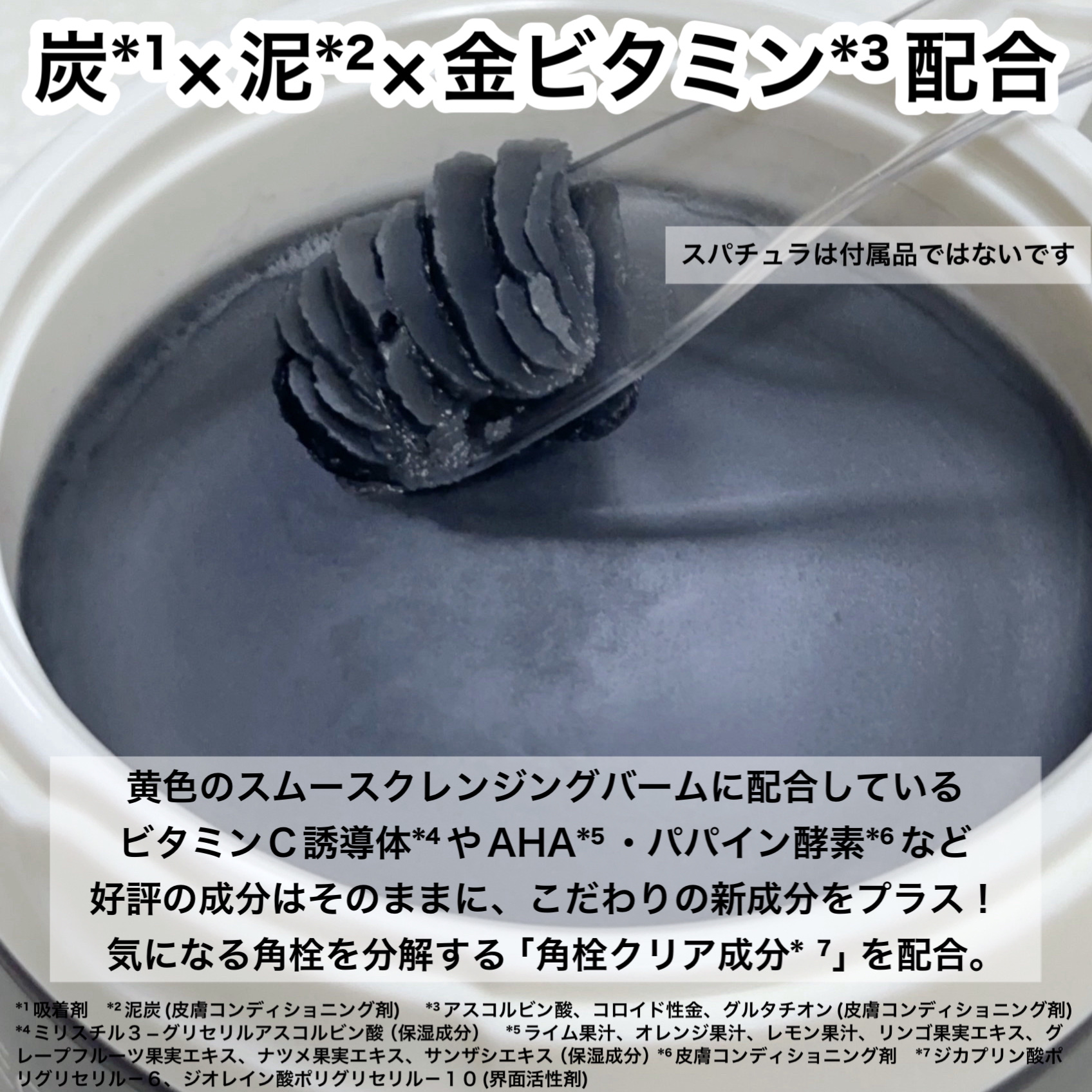 - 炭*1×泥*2×金ビタミンC*3配合の本気の毛穴ケアクレンジングバーム。 ビタミンC誘導体*4やAHA*5・パパイン*6酵素など人気の毛穴ケア成分に加え、頑固な角栓を分解することができる角栓クリア成分*7や黒ずみ汚れ除去成分の炭*1や泥(ピート)*2、3種のビタミンC*8などこだわりの成分を配合。 天然由来のオレンジとローズの精油をブレンドした甘く爽やかな香り。 W洗顔不要。まつエクOK*9。 *1吸着剤 *2泥炭(皮膚コンディショニング剤) *3アスコルビン酸、コロイド性金、グルタチオン(皮膚コンディショニング剤) *4ミリスチル3−グリセリルアスコルビン酸 (保湿成分) *5ライム果汁、オレンジ果汁、レモン果汁、リンゴ果実エキス、グレープフルーツ果実エキス、ナツメ果実エキス、サンザシエキス(保湿成分) *6皮膚コンディショニング剤 *7ジカプリン酸ポリグリセリル-6、ジオレイン酸ポリグリセリル-10(界面活性剤) *8アスコルビン酸、コロイド性金、グルタチオン(皮膚コンディショニング剤)、ミリスチル3−グリセリルアスコルビン酸、パルミチン酸アスコルビルリン酸3Na (保湿成分) *9一般的なグルー(シアノアクリレート系の成分)をご利用の場合はお使いいただけます。