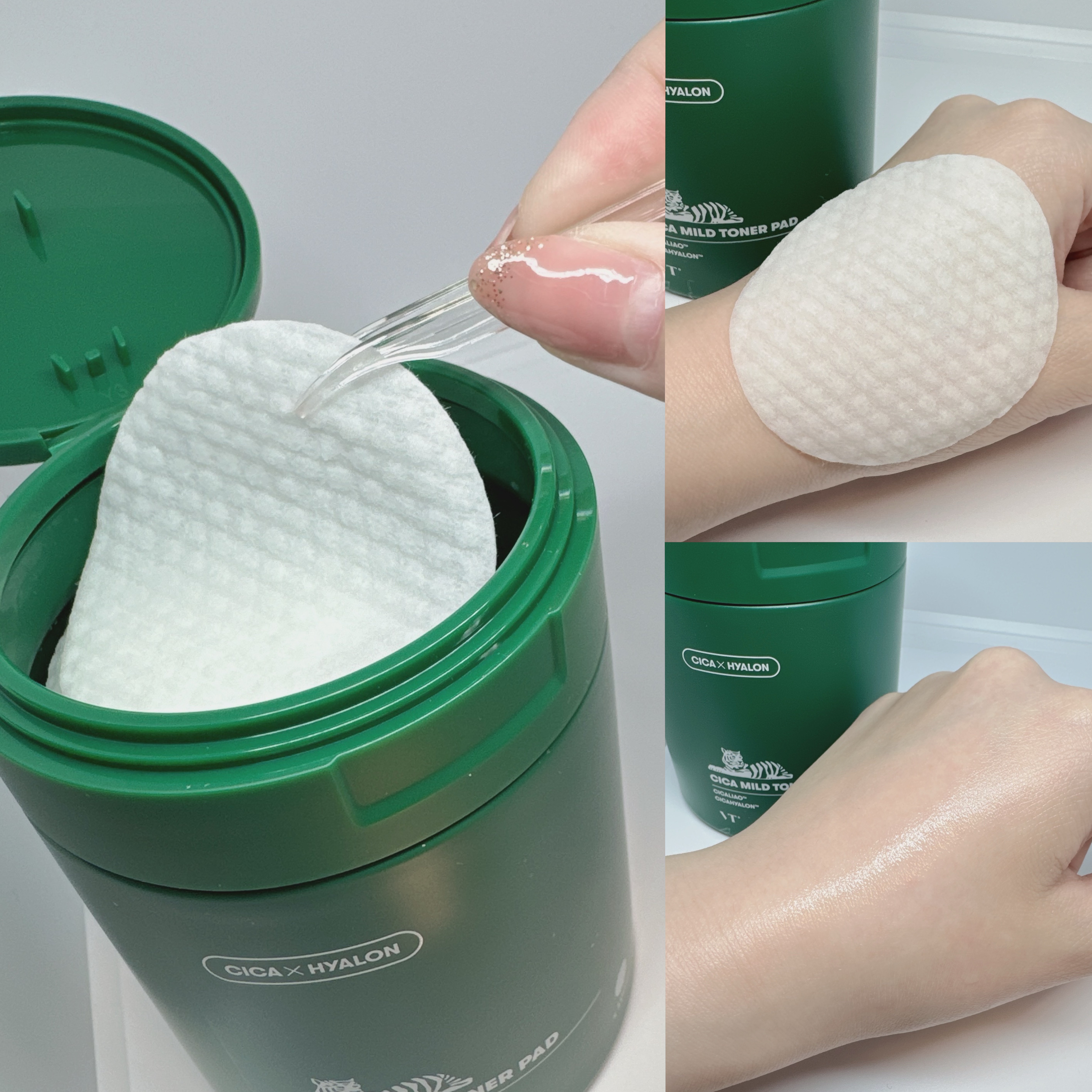 でこぼこのエンボス面で不必要な角質や毛穴汚れなどを拭き取れるトナーパッド! 朝ぬるま湯で顔を洗ってから、メイク前にトナーパットで拭き取るのが大好き🌟 夜のケアだと、赤みやポツポツニキビが気になる部分にパットを抑えて部分用パックとして使うのも好き!! VTのCICAはとにかく肌荒れが気になる時 (赤みやニキビ)に使用するのがおすすめ🌿💚