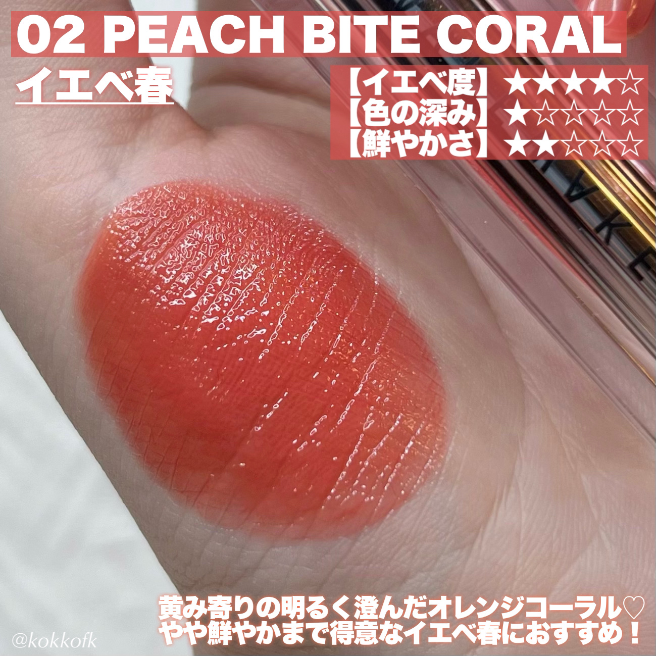 既存のジューシーラスティングティントよりさらに軽いツヤ感が魅力の新作ティント! 色選びの参考にしてね! やや黄みの明るいオレンジコーラル鮮やか得意なイエベ春におすすめ! 黄みの明るくまろやかなオレンジベージュ黄みが得意なイエベ春におすすめ! 青み黄み中間なくすみピンクベージュブルベ夏やイエベ春におすすめ 黄みの深くて鮮やかなオレンジレッド鮮やか得意なイエベ秋におすすめ! 青みの鮮やかで明るいビビッドピンク明るさ得意なブルベ冬やブルベ夏におすすめ! 青みの明るめで柔らかいローズピンクブルベ夏やブルベ冬におすすめ! 青み黄み中間な鮮やかで強いビビッドレッド2ndイエベ春のブルベ冬におすすめ! 青みの強い深くて鮮やかなベリーレッド2nd夏で鮮やか得意なブルベ冬におすすめ!