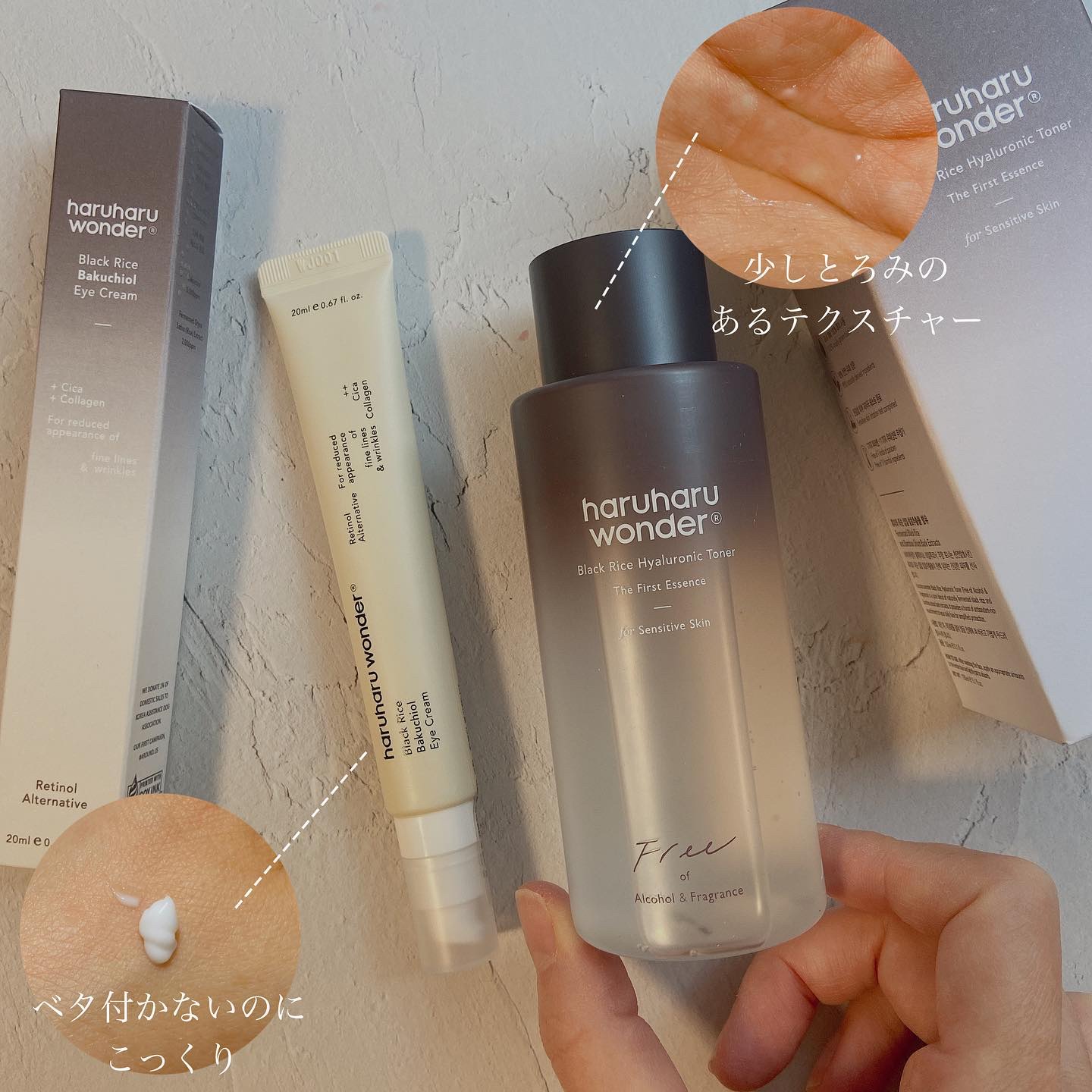 黒米を発酵させ肌に良い成分を凝縮。豊富な栄養と抗酸化作用で、肌にハリとツヤを与え健やかに保ちます。 トナーはさらっとしたテクスチャーで肌に潤いを与えキメを整えてくれます。アルコール、香料フリーの使いやすい処方! アイクリームにはバクチオールが配合され、肌のハリへとアプローチ。年齢サインの気になる方にはぴったりです。