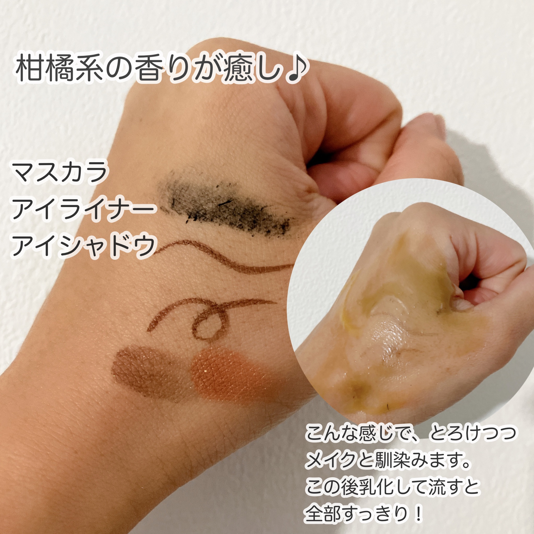 ちょっとシャーベット状のバームです。 でも手に乗せるとトロける!馴染むの早い! 【W洗顔不要】は間違いなかったです。 洗い流した後の、『なんかまだ顔にいるな』 みたいなヌルつきというか膜感はなく 普通にしっとりでした! メイク落ちに関してはスッキリ落ちて マスカラとアイライナーもくるくるしたら ちゃんと取れました! 使用感ではそこまで違いを感じませんでした。全肌タイプ用だからといってつっぱることもなく 敏感肌用だからってヌルっと感が残るとかもなく。 他のクレンジングバームより 価格もお手頃だし全てにおいて『丁度いい』 ので、なくなったらリピしようと思います!